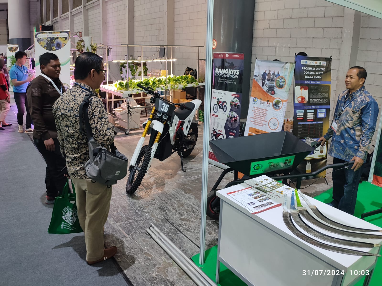 Direktur DRPM Fadlilatul Taufany, S.T., Ph.D. Sedang mempresentasikan gerobak sorong (Wheel Barrow) bertenaga listrik. Produk penelitian dari Grant Riset Sawit (GRS) 2023 yang dibuat oleh Dr. Lila Yuwana, M.Si. Dari Puslit SF