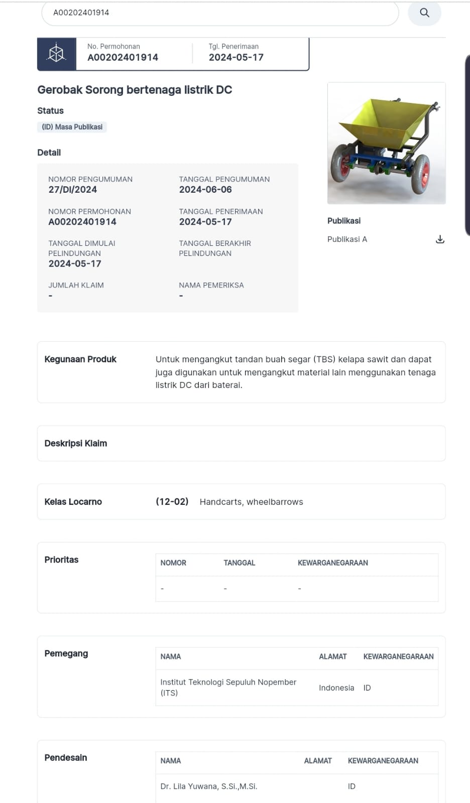 Surat Pencatatan Ciptaan Hak Cipta Blueprint (Cetak Biru) Gerobak Sorong (Wheel Barrow) Bertenaga Listrik