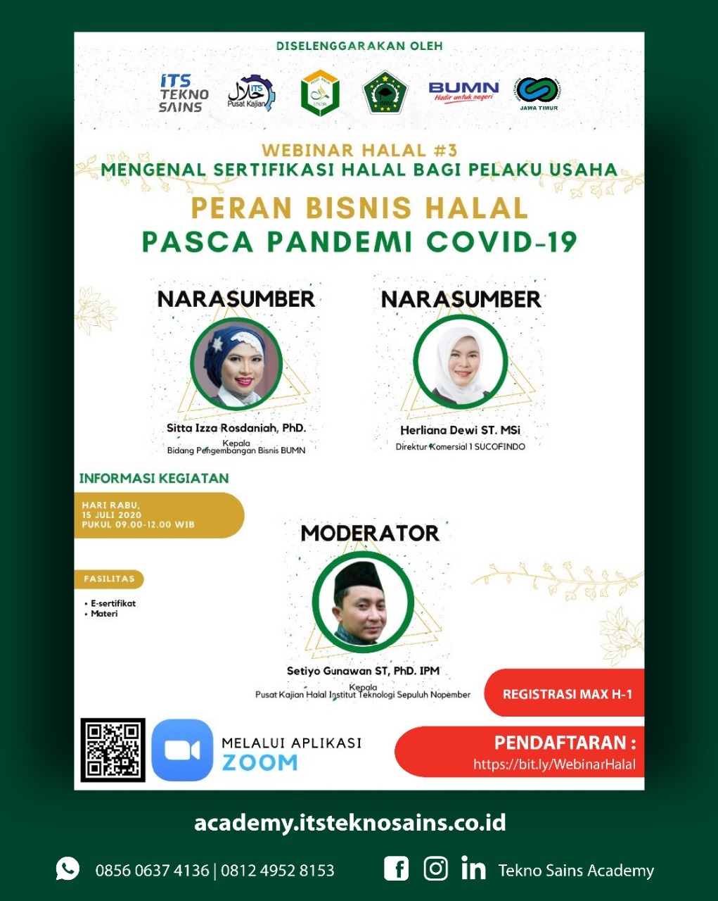 Pusat kajian Halal ITS bekerjasama dengan Universitas Nahdhatul Ulama Surabaya (UNUSA), Ikatan Sarjana Nahdhatul Ulama (ISNU) Surabaya, dan Lembaga Pengkajian Pangan, Obat-obatan, Kementrian BUMN, dan Sucofindo telah mengadakan Webinar Peran Bisnis Halal Pasca Pandemi Covid-19 secara online pada tanggal 15 JUli 2020.