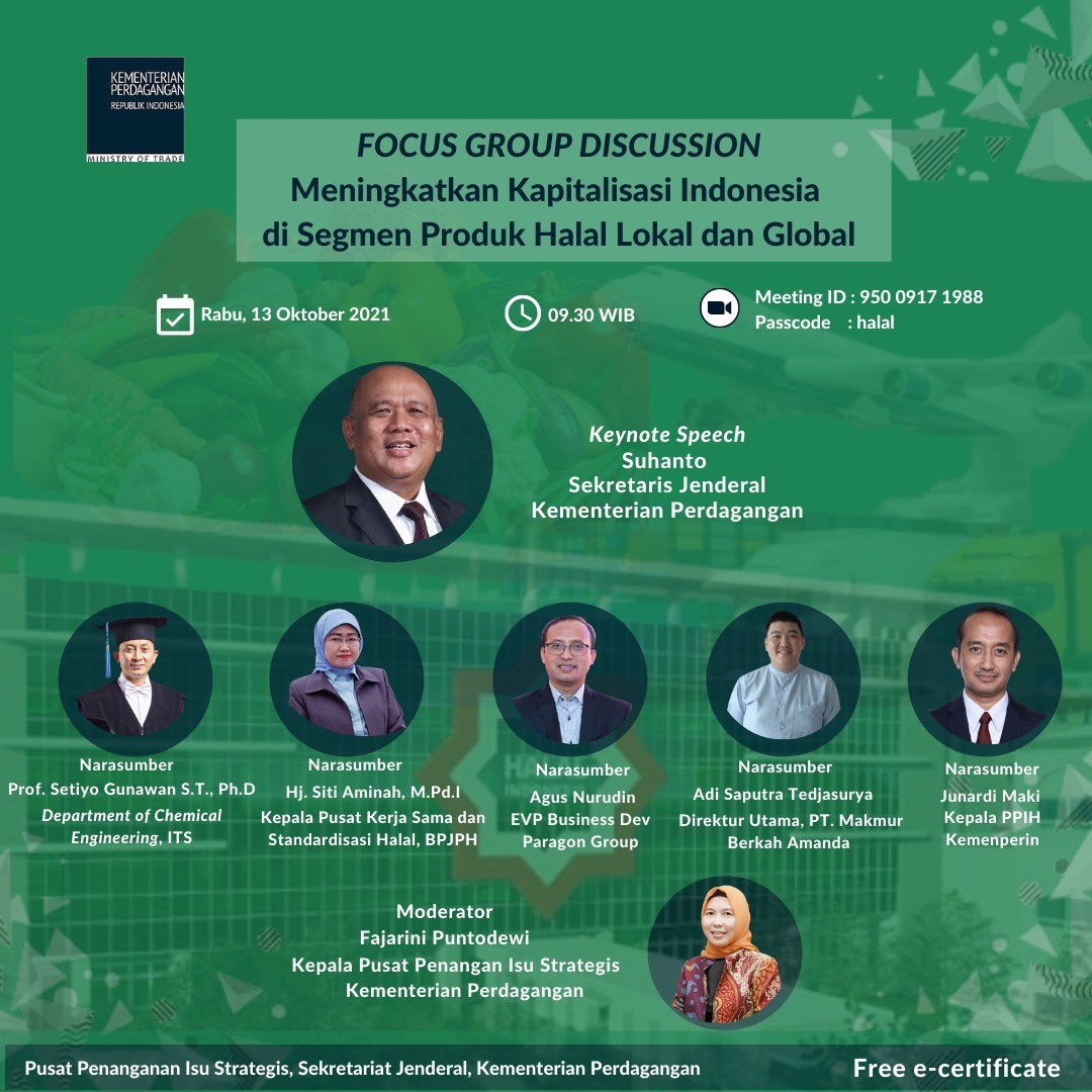 Kementrian Perdagangan RI telah mengadakan Forum Group Discussion (FGD) yang bertujuan untuk meningkatkan Kapitalisasi Indonesia di Segmen Produk Halal Lokal dan Global secara online pada tanggal 13 Oktober 2021.