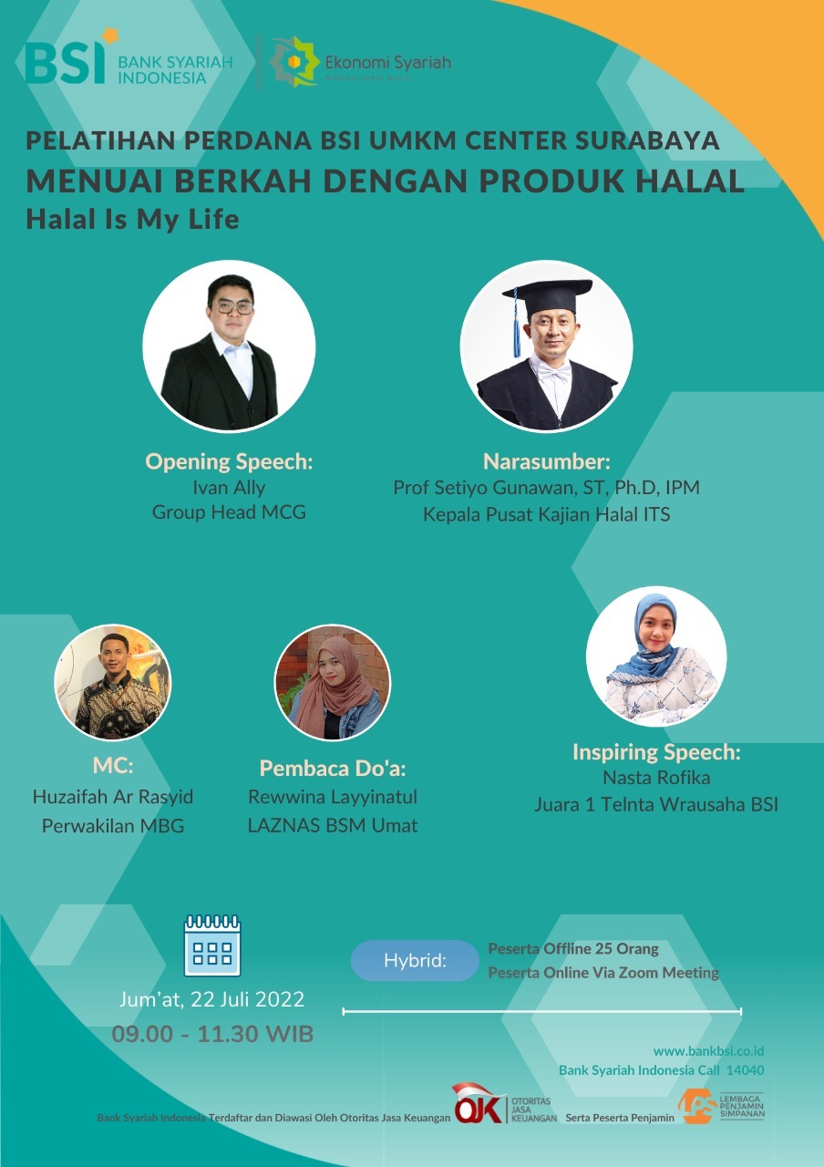 bertempat di BSI UMKM Center yang terletak di Jalan Kartini No 107 Surabaya telah dilaksanakan Pelatihan perdana terkait menuai berkah dengan produk halal. Narasumber yang hadir adalah Prof Setiyo Gunawan (Kepala Pusat Kajian halal ITS) dan Nasta Rofika ST (Juara 1 Talenta Wirausaha BSI).  Dalam paparannya, Prof Gunawan menjelaskan terkait 4 tantangan bagi UMKM, yaitu