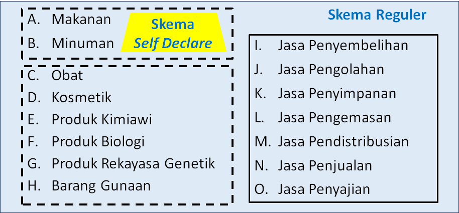 Sedangkan skema self declare, hanya khusus untuk (i) pelaku usaha mikro kecil dan (ii) produk yang tidak beresiko pada jenis produk makanan dan minuman yang tertuang di Keputusan kepala Badan BPJPH No 22/ 2023