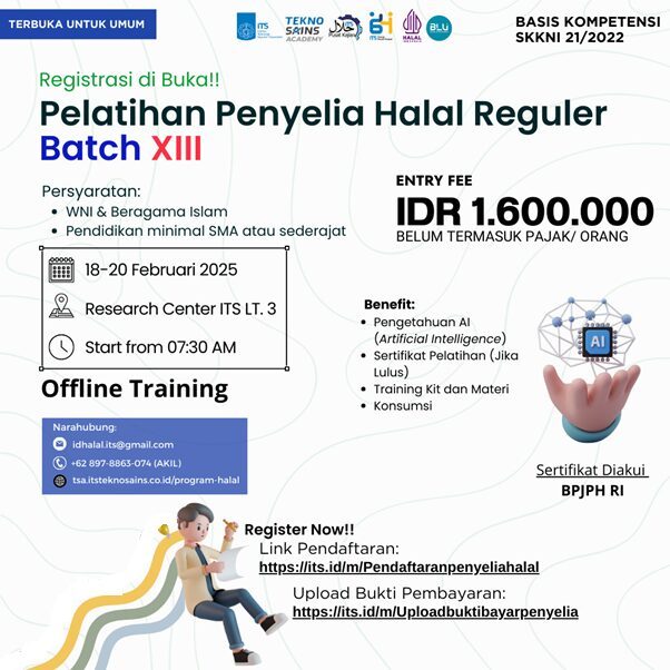 Saat ini kehadiran penyelia halal amat dibutuhkan. Sebab, kewajiban sertifikasi halal telah diberlakukan sejak Oktober 2024 bagi pelaku usaha menengah dan besar. Pendaftaran peserta penyelia halal batch XIII telah resmi dibuka oleh Lembaga Pelatihan Jaminan Produk Halal (LPJPH), Tekno Sains Academy (TSA) Institut Teknologi Sepuluh Nopember (ITS) (25/1/2025). ). “Kegiatan ini akan digelar selama 3 hari, dari 18 sampai dengan 20 Februari 2025 dengan Link Pendaftaran: https://its.id/m/Pendaftaranpenyeliahalal,” tambah Dr Nasori.
