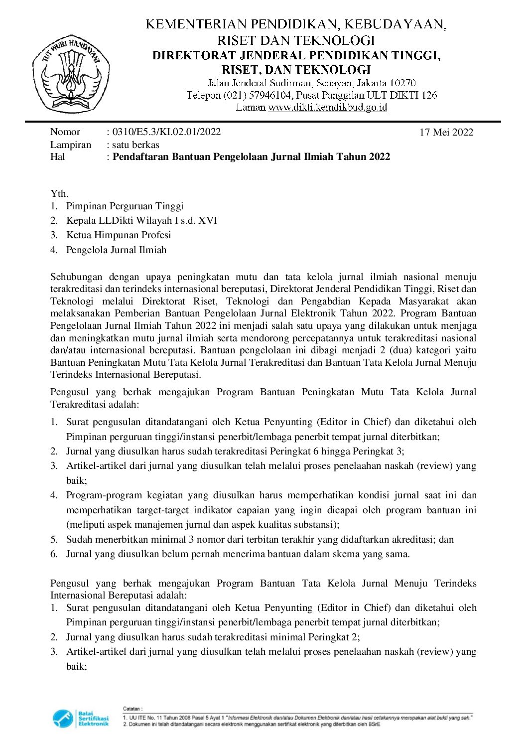Pendaftaran Bantuan Pengelolaan Jurnal Ilmiah Tahun 2022