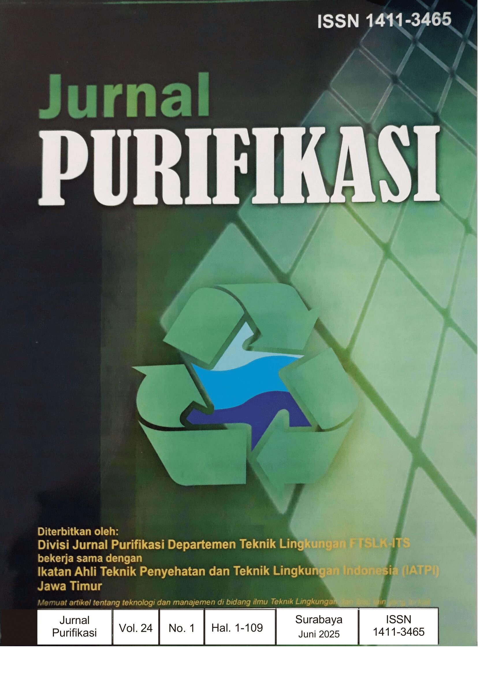 Jurnal Purifikasi (e-ISSN: 2598-3806) has been published since January 2000 by Division of Jurnal Purifikasi, Department of Environmental Engineering, Faculty of Civil, Planning, and Geo Engineering, Institut Teknologi Sepuluh Nopember Surabaya, in collaboration with the Association of Indonesian Sanitary and Environmental Engineers (IATPI) East Java. Jurnal Purifikasi is published twice a year, in June and December, covering topics related to technology and management in the environmental engineering field.