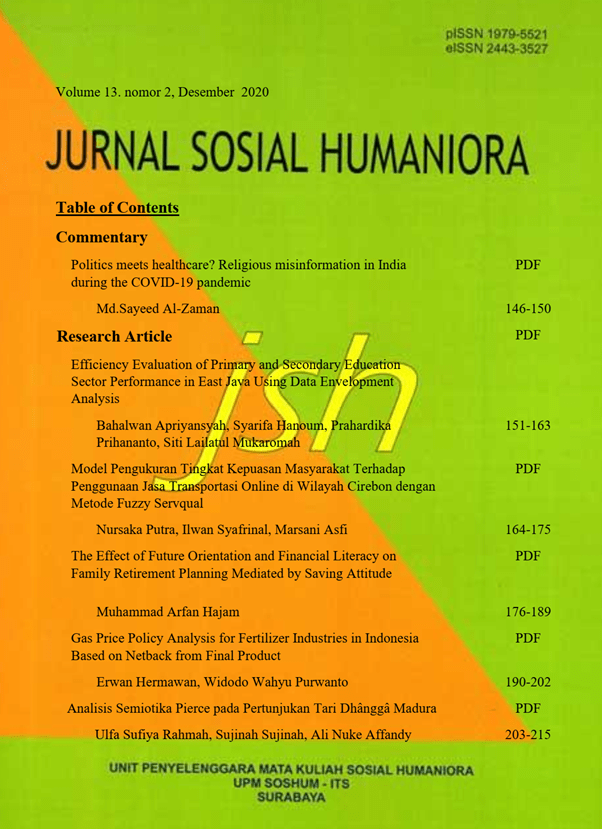 Jurnal Sosial Humaniora (JSH) is published by LPPM-Institut Teknologi Sepuluh Nopember with its main aim to spread critical and original analysis from researchers and academic practitioners on various contemporary social and humanities issues both local and foreign. The writing is published after undergoing a peer-review process by providing an exclusive analysis of social and humanities issues from various perspectives. JSH provides high-quality study outcomes and new insights for academic practitioners, researchers, and decision-makers to break down the complexity and dynamics of contemporary social changes. Published two times a year: July and December, JSH provides itself as a medium for – also invites- researcher, academic practitioners, and intellectuals to submit their critical writings and to contribute to the development of social and humanities sciences.
