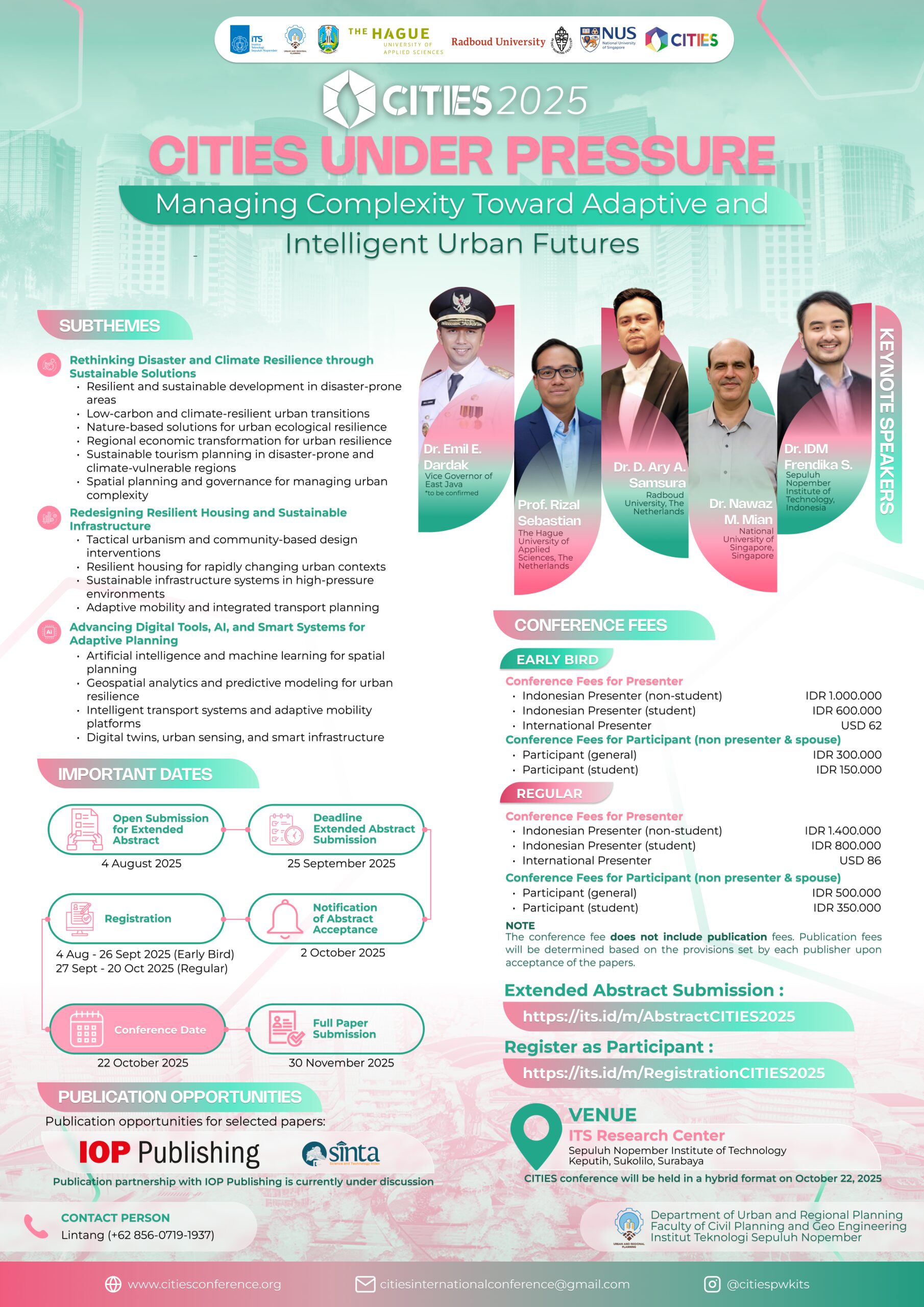The CITIES International Conference is an annual international conference organized by the Department of Urban and Regional Planning, Institut Teknologi Sepuluh Nopember (ITS Surabaya).