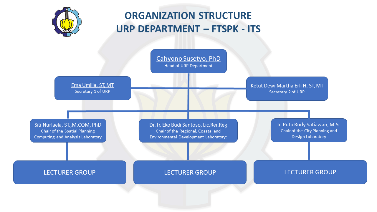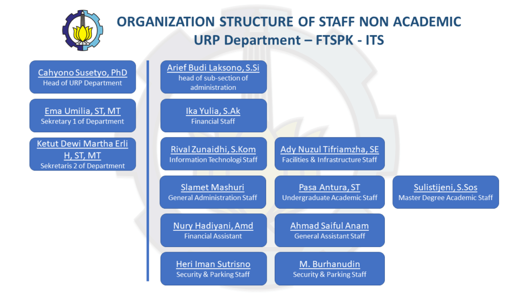 In accordance with the ITS OTK the responsibility in managing the department is in the hands of the Head of the Department assisted by the Secretary of the Department. The Head of Department is responsible for leading the department to realize the vision and mission of the Department which is also a reflection of the vision and mission of the Faculty and ITS. To realize the vision and mission, the Head of the Department mobilizes and mobilizes all elements, both lecturers, education staff, and students. The basic step taken is to formulate the organizational structure of the department according to the ITS OTK, formulate a structured work program from the vision and mission, establish clear division of tasks for each unit based on the established work program, formulate budgeting, carry out monitoring and evaluation, and formulate administrative responsibilities and finance to the leadership in this case the dean and rector.