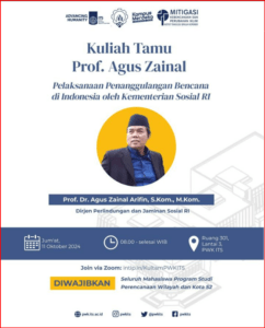 The ITS PWK Department will hold a guest lecture on the topic “Implementation of Disaster Management in Indonesia” which will be presented by Prof. Dr. Agus Zainal Arifin, S.Kom., M.Kom. as a representative of the Director General of Social Protection and Security of the Republic of Indonesia.