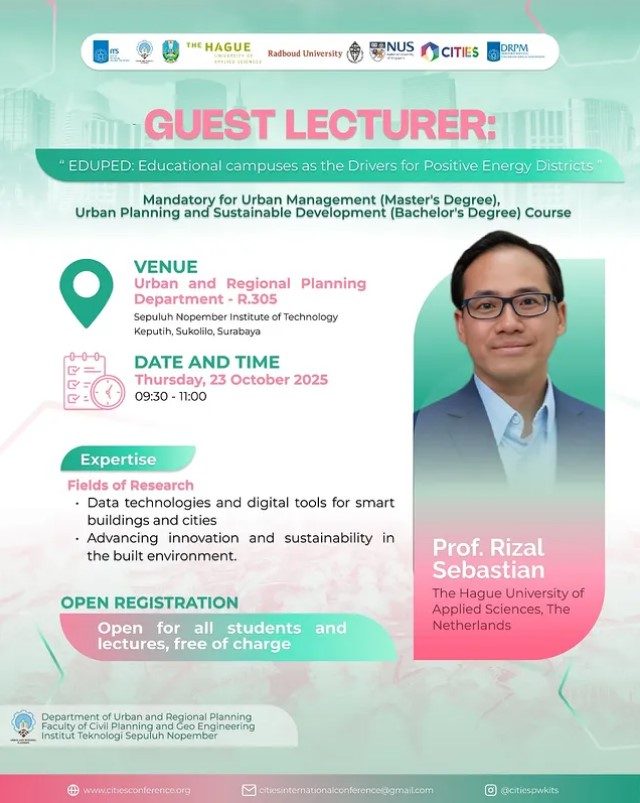 Berkenaan dengan konferensi tahunan CITIES 2025, Departemen PWK ITS akan mengadakan kuliah tamu yang akan diisi oleh Prof.Rizal Sebastian dari The Hague University of Applied Science, The Netherlands, yang akan diadakan pada:
