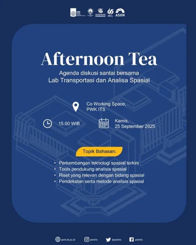 Akan dilaksanakan agenda diskusi santai yang akan diprakarsai oleh Lab Transportasi dan Analisa Spasial PWK ITS. Diskusi akan membahas topik seputar optimalisasi analisa spasial. Agenda akan dilaksanakan pada: