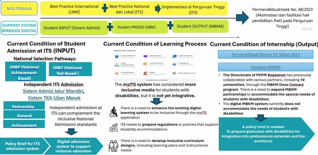 This research uses a multiscale approach that integrates three main pillars: Student Input (Admissions), Student Process (Learning), and Student Output (Graduates & Careers). Data was collected through gap analysis, benchmarking with other universities (like UNESA and UNPAM) , and 33 workshops and Focus Group Discussions (FGDs) involving approximately 20 people with disabilities, lecturers, ITS leadership, and strategic partners like Bappenas and YPAB (Foundation for Blind Children Education).