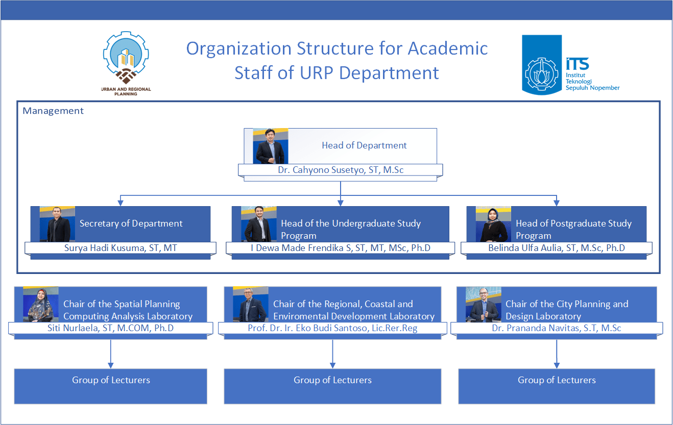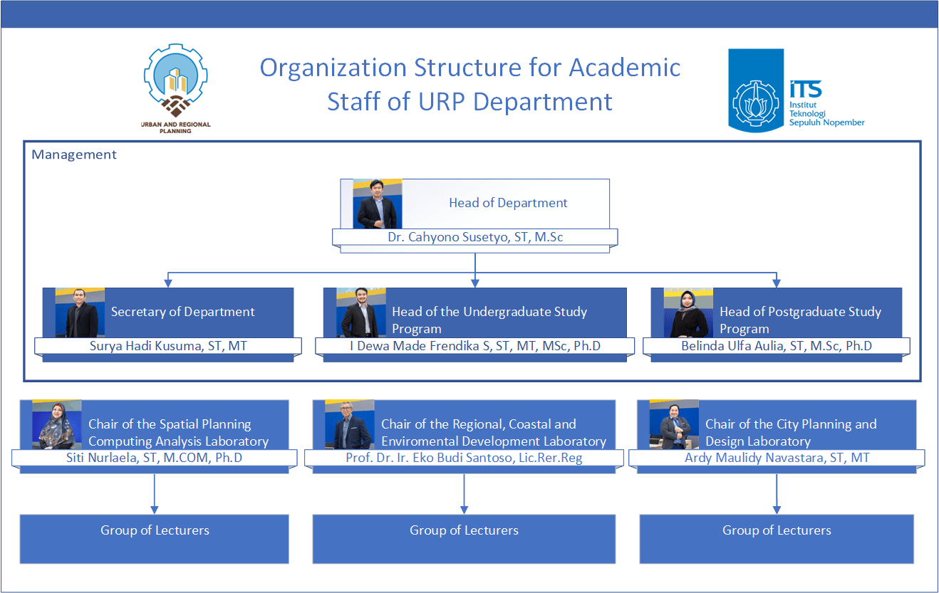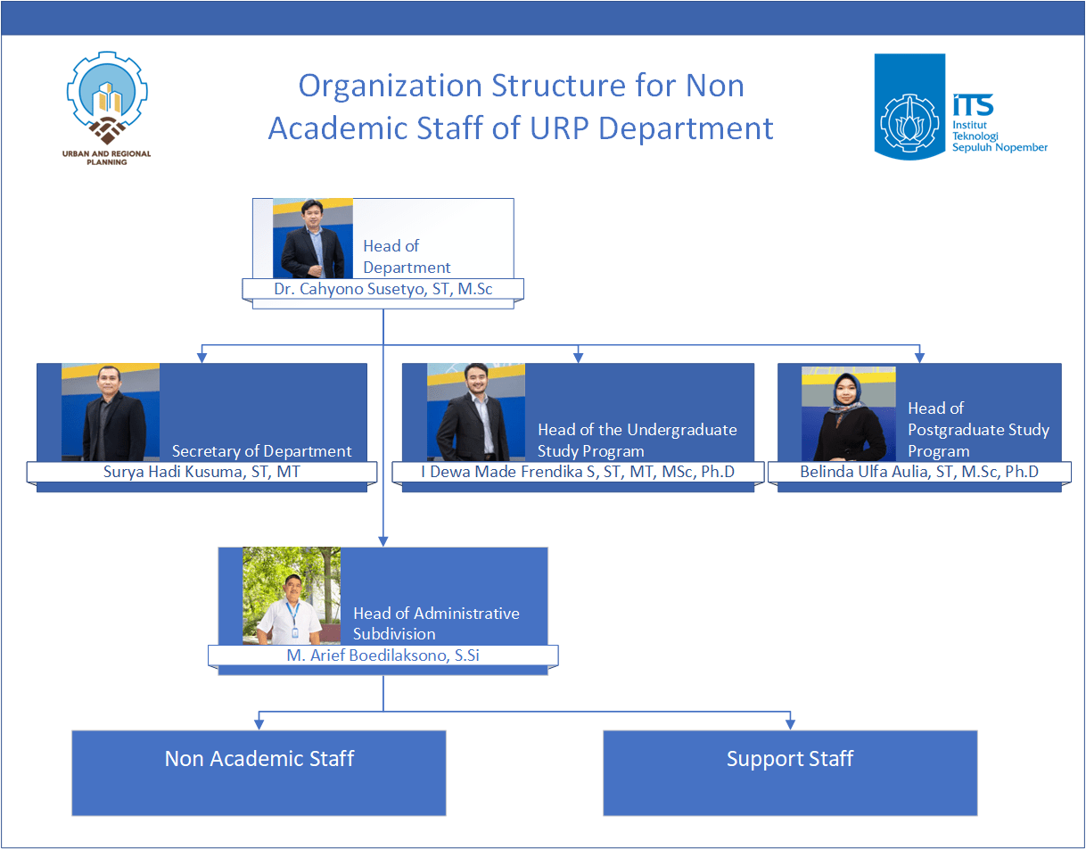 Sesuai dengan OTK ITS tanggung jawab dalam mengelola jurusan berada di tangan Kepala Departemen dibantu Sekretaris Departemen. Kepala Departemen bertanggung jawab memimpin jurusan untuk mewujudkan visi dan misi Departemen yang juga merupakan cerminan dari visi dan misi Fakultas serta ITS. Untuk mewujudkan visi dan misi, Kepala Departemen menggerakkan dan memobilisasi semua unsur, baik dosen, tenaga kependidikan, serta mahasiswa. Langkah mendasar yang dilakukan adalah merumuskan struktur organisasi jurusan sesuai OTK ITS, merumuskan program kerja yang terstruktur dari visi-misi, menetapkan pembagian tugas yang jelas untuk setiap unit berdasarkan program kerja yang ditetapkan, merumuskan penganggaran, melaksanakan monitoring dan evaluasi, serta menyusun pertanggungjawabannya secara administratif dan keuangan kepada pimpinan dalam hal ini pihak dekanat dan rektorat.