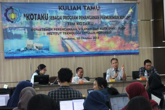 Kuliah Tamu di jurusan PWK oleh Tim Kotaku, diisi oleh Tim Leader Propinsi Jawa Timur, . Kuliah tamu ini membahas tentang pernana Kotaku dalam menuntaskan permasalhan permukiman Kumuh yang ada di Indonesia, khususnya Jawa Timur. Kotaku sudah terdapat di 36 kabupaten kota di Jawa Timur, kecuali Ngawi dan Sampang dan sebanyak 1857 kelurahan desa. Dalam diskusi ini beliau menerangkan tentang seluk beluk proses dan program-program kotaku. Proses yang berlangsung dalam Kotaku ini adalah mengajak relawan, mengikutsertakan peranan masyrakat, kemudian membuat dokumen survey yang dijadikan untuk rujukan dalam pengembangan aternatif –alternatif yang sesuai. Tujuannya adalah menciptakan akses infrastruktur dan pelayanan dasar yang layak huni, produktif dan berkelanjutan. Pelaku-pelaku dalam kotaku meliputi pemerintah, masyrakat dan akademisi. Terdapat tujuh inidikator penilaian kumuh yaitu drainase, sampah, sanitai, keteraturan bangunan, jalan, air bersih dan kebakaran yang kemudian dipecah lagi menjadi 19 kriteria. Latar belakang munculnya urgensi penanganan permukiman kumuh ini tertuang pada uud 1945 yang menjelaskan bahwa semua penduduk berhak mendapatkan tempat tinggal Pasal 28 H ayat 1. Hal ini juga terdapat dalam kebijakan presiden yang tertuang dalam RPMJN 2014-2019. Gerakan ini yang terkenal adalah 100 0 100. Yaitu 100 air berish, 0 permukiman kumuh, dan 100 sanitasi. Targetnya, pada tahun 2019, terdapat 0 kawasan permukiman kumuh di Indonesia. Oleh karena itu, untuk mewujudkannya, pemerintah memerlukan bantuan dan partisipasi dari semua pihak yang terlibat di dalamnya. Tujuan akhirnya adalah meningkatkan akses infrastruktur pelayanan dasar dan mengurangi kekumuhan dengan tujuan antar adalah mengurangi kawasan kumuh, pokja perumahan dan permukiman yang teridiri dari lintas dinas dan sector swasta, meningkatnya penghasila masyrakat, terlaksana aturan bersama sehingga perilaku masyrakat menjadi lebih baik. Strategi yang dikembangkan adalah kolaborasi semua pihak, meningkatkan kapasitas, partisipatif, memsasukkan ke dalam RPJM, meningkatkan akses terhadap pelayan dasar lingkungan, advokasi, mengubah perilaku masyarakat ke arah yang positif. Perubahan ini nyta harus dipelopori oleh masyarakat itu sendiri dalam menciptkan permukiman yang bebas kumuh. Prinsip yang dikembangkan adalah menyusun dokumen partisipatif dokumen rencana aksi bangunan, lingkungan, permukiman. Sinkronisasi pendekatan perencanaan, tata kelola yang baik, investai. Komponen program adalah pembangunan kelembagaan dan kebijakan, integrasi perencanaan dalam interaksi dan musyawarah bersama masyarakt, peningkatan kualitas infrastruktur, dukungan pelaksanaan dan teknis, dukungan untuk kondisi darurat bencana. Pada tingkat kelurahan akan dihasilkan recana strategis sedangkan di tingkat kota menghasilkan musrembang. Dokumen yang dihasilkan pada tingkt kota dalah RP2KPKP dan pada tingkat kelurahan dokumennya adakah RPLP. Prioritas yang ditetapkan PU untuk diintervensi penangan kota kumuh yaitu Gresik, Tulungagung, Sidoarjo, Malang, Surabaya. Kota ini didapatkan dari data base line survey tahun 2015 yang menjadi rujukan penetapan lokasi kumuh. Juga terdapat klasifikasi dari tingkat kekumuhan yaitu kumuh berat, sedang, ringan. Intervensi bisa dalam bentuk pemugaran bangunan oleh pemerintah daerah. Bisa juga melakukan peremajaan di tanah yang legal, atau perumahan kembali dalam bentuk rusunanwa rusunami. Contoh di Aceh paska tsunami dibentuk komunitas untuk membangun rumah yang sesuai dengan lembaga donor. Sehingga dari satu lembaga donor tersebut, akan mempunyai kemiripan bangunannya. Tahap pengelolaan akan membuat masyarakat mau menjaga fasilitas yang sudah dibangun agar tetap baik kondisinya. Namun dalam praktik pelaksanaanya, ternyata tidak cukup hanya dengan membangun infrastuktur, namun harus merubah pola perilaku masyrakat sehingga bisa memanfaatkan infrastruktur yang sudah dibangun. Perencanaan yang dilakukan adalah partisipatif, yaitu perencanaan nyang melibatkan peran serta masyarakat dan pemerintah daerah. Dalam hal ini masyarakat mampu mengusulkan apa ynag menjadi kebutuhannya. Dari segi pembiayaan menggunakan BDI yaitu Bantuan Dana Investasi. Target yang diinginkan dari kotaku ini adalah 0% kumuh pada tahun 2019.