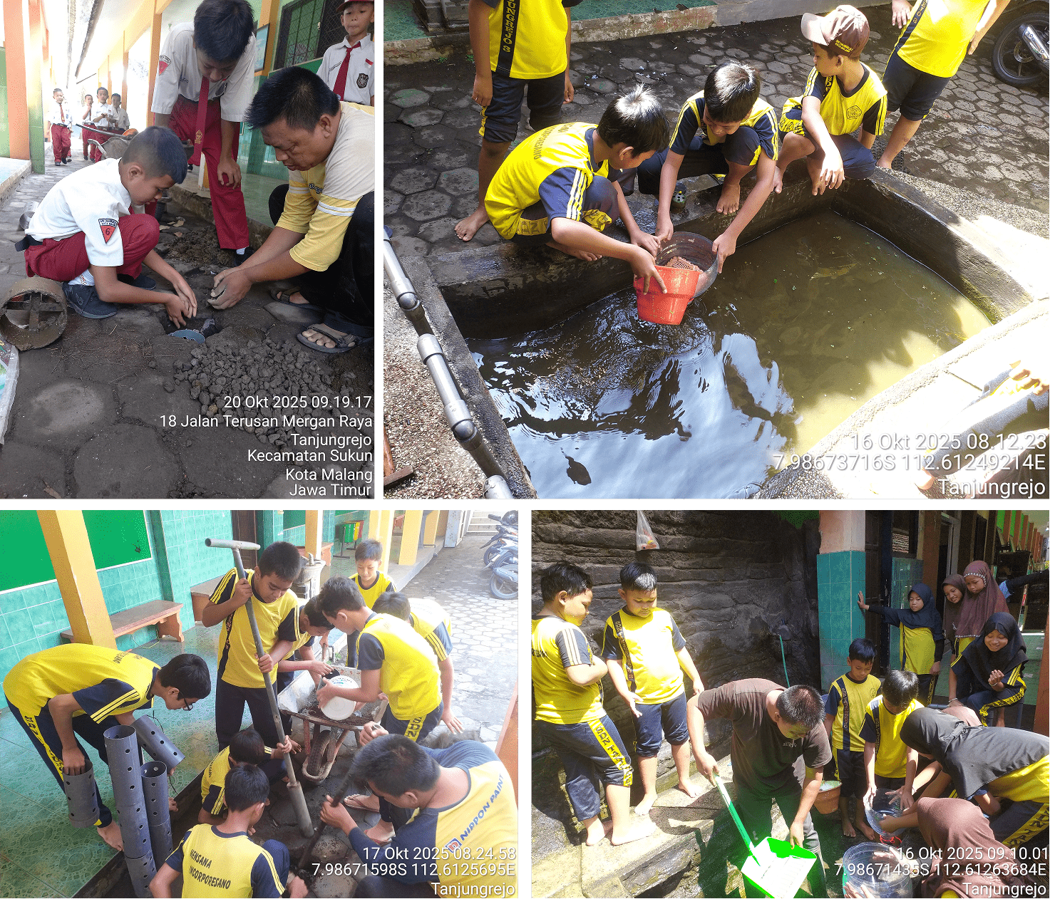 SDN Tanjungrejo 3 di Kota Malang menghadapi dua masalah lingkungan yang nyata: ketergantungan total pada air sumur yang rentan kering saat kemarau dan genangan air hujan yang mengganggu aktivitas akibat lahan yang minim daya serap .
