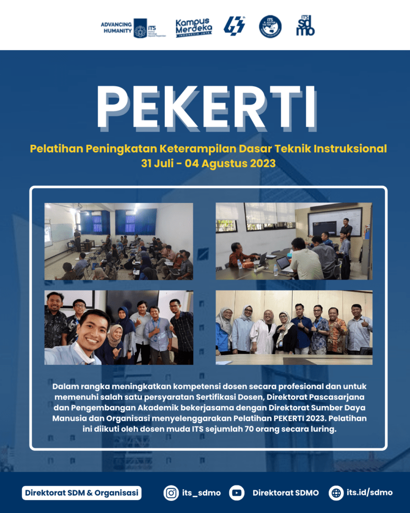 Direktorat Pascasarjana dan Pengembangan Akademik bekerjasama dengan Direktorat Sumber Daya Manusia dan Organisasi telah menyelenggarakan Pelatihan Peningkatan Keterampilan Dasar Teknik Instruksional (PEKERTI). Kegiatan ini bertujuan untuk meningkatkan kompetensi dosen secara profesional dan untuk memenuhi salah satu persyaratan Sertifikasi Dosen ITS.
