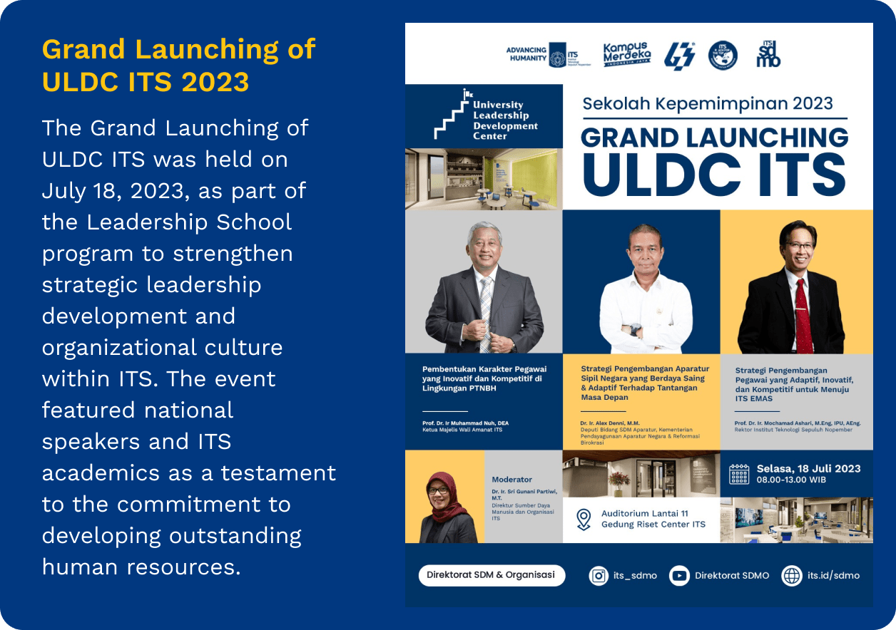 The University Leadership Development Center (ULDC) ITS is a leadership development hub within the campus environment, aiming to cultivate outstanding human resources with strong character, well-prepared to face future challenges.