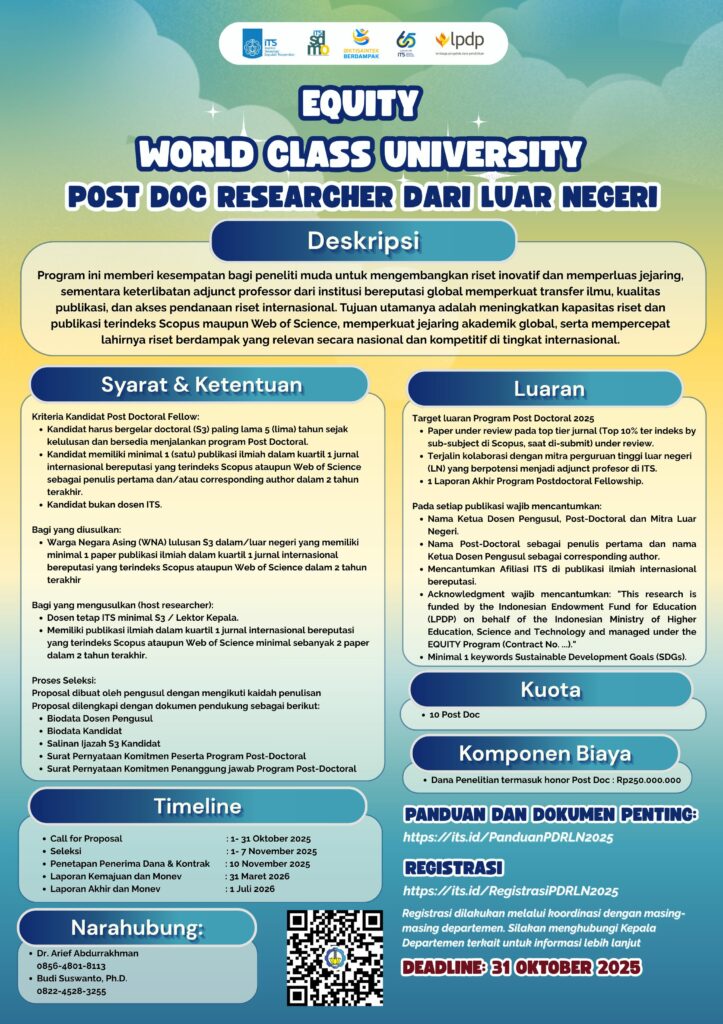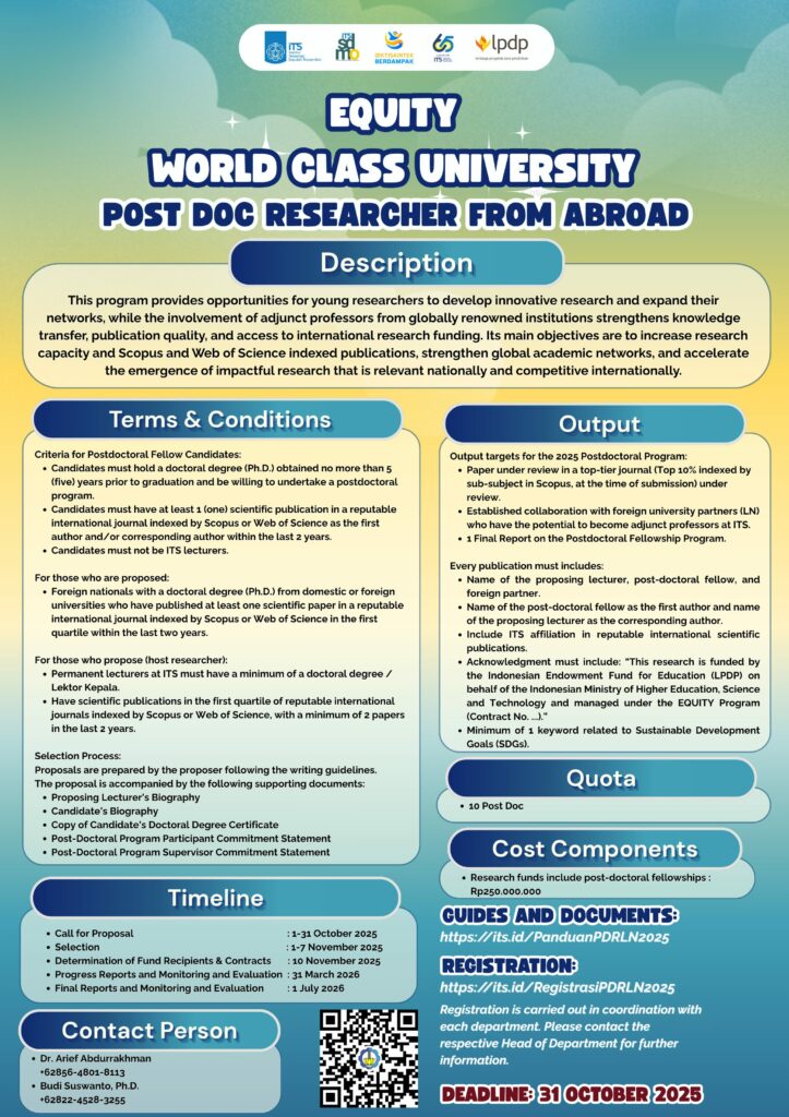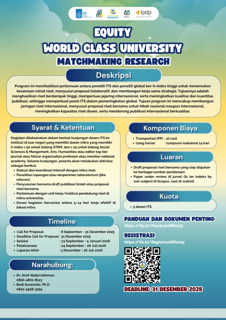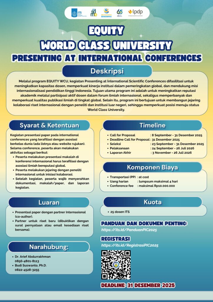 Program EQUITY WCU menghadirkan enam skema strategis yang dirancang untuk mendukung pengembangan kompetensi akademik, kolaborasi riset, dan penguatan jejaring internasional: