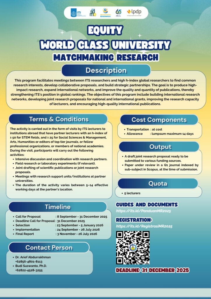 Melalui Direktorat SDMO, ITS menghadirkan ekosistem akselerasi bagi dosen dan peneliti untuk berkiprah di kancah global. Program ini dirancang untuk meningkatkan kualitas publikasi, memperluas jejaring riset internasional, dan mendatangkan pakar dunia ke kampus ITS.