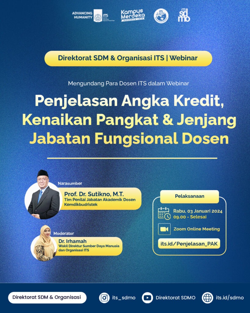 Direktorat Sumber Daya Manusia dan Organisasi (SDMO) Institut Teknologi Sepuluh Nopember (ITS) baru-baru ini mengadakan webinar bertujuan untuk meningkatkan pemahaman dosen terkait mekanisme angka kredit dan jabatan fungsional terbaru. Jabatan fungsional adalah posisi yang berisi fungsi dan tugas terkait pelayanan fungsional berdasarkan keahlian dan keterampilan tertentu. Angka Kredit adalah satuan nilai dari kegiatan yang harus dicapai oleh Pejabat Fungsional untuk pembinaan karier. Selain itu, Angka Kredit Kumulatif adalah akumulasi nilai minimal yang harus dicapai untuk kenaikan pangkat dan jabatan.