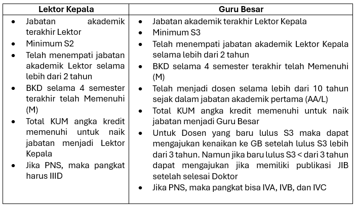 Proses pengajuan kenaikan jabatan akademik Dosen khusus kenaikan menjadi Lektor Kepala dan Guru Besar akan dilakukan pada platform SISTER. Fitur untuk kenaikan jabatan akademik akan segera dirilis di SISTER dan dapat diakses oleh Operator Pengakuan Angka Kredit (PAK).