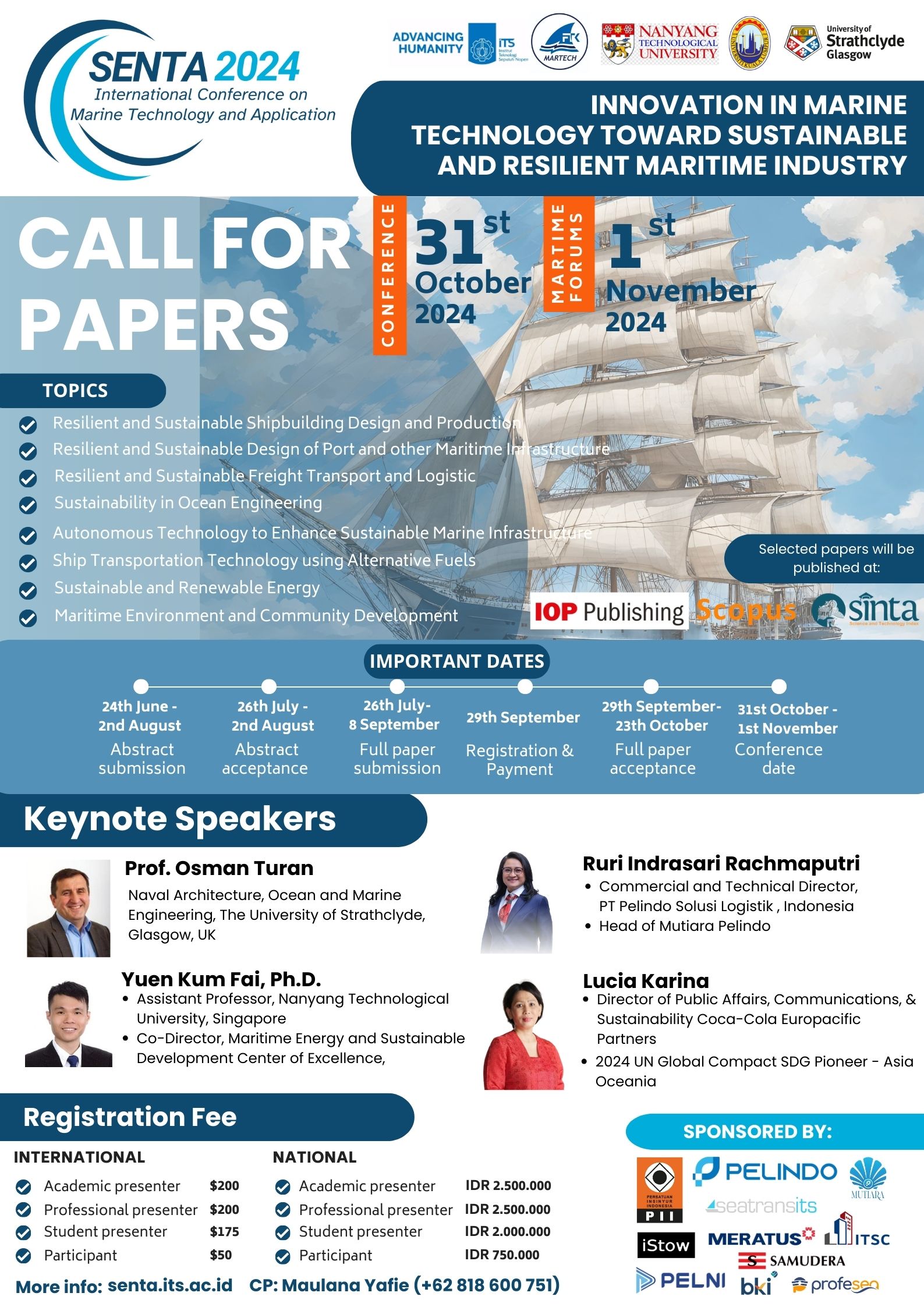 We are thrilled to announce that the 24 th International Conference on Marine Technology (SENTA 2024) will be held at Institut Teknologi Sepuluh Nopember, Surabaya, on 31 October- 1 November 2024. This year’s conference theme, “Innovation in Marine Technology Toward Sustainable and Resilient Maritime Industry”, reflects our commitment to addressing the pressing challenges and opportunities within the maritime sector. As we navigate an era marked by rapid technological advancements and environmental concerns, the need for sustainable and resilient maritime solutions has never been more critical.