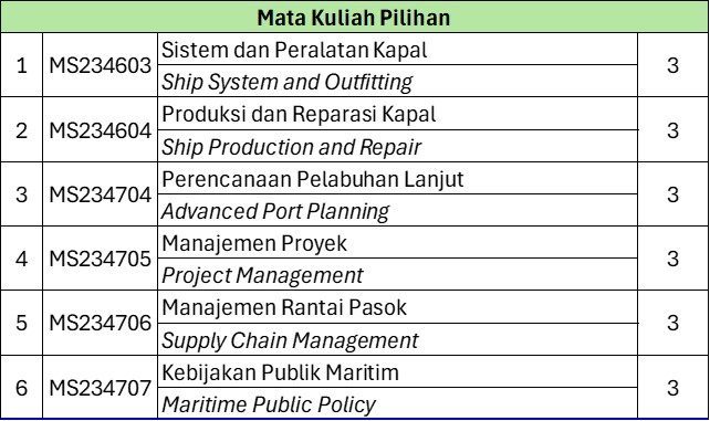 Disamping mata kuliah yang bersifat tatap muka di kelas, juga terdapat mata kuliah yang bersifat Tugas dan Praktik, serta mata kuliah pilihan tentang Pelayaran (Shipping), Pelabuhan, dan Logistik Maritim.