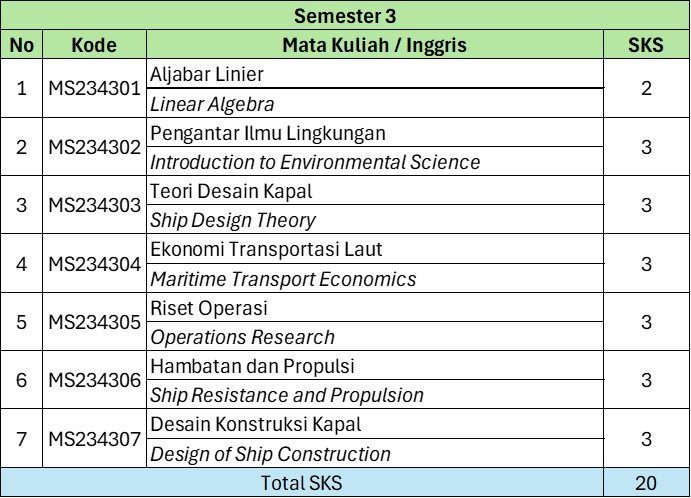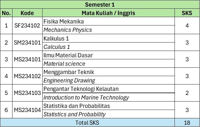 Rancangan kurikulum ini disusun dengan mengacu pada peraturan yang berlaku yaitu UUÂ 12/2012 tentang Pendidikan Tinggi, Permendikbud 03/2020 tentang Standar Nasional Pendidikan Tinggi (SN- Dikti) dan Keputusan Rektor ITS 888/IT2/T/HK.00.01/2022 tentang Pedoman Evaluasi dan Pengembangan Kurikulum ITS 2023-2028. Dokumen kurikulum ini diharapkan akan dapat menjadi pedoman dalam proses kegiatan pembelajaran di Progam Studi Sarjana Teknik Transportasi Laut Fakultas Teknologi Kelautan ITS.