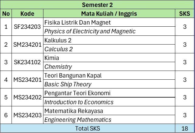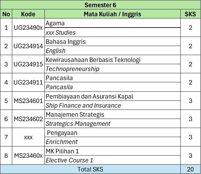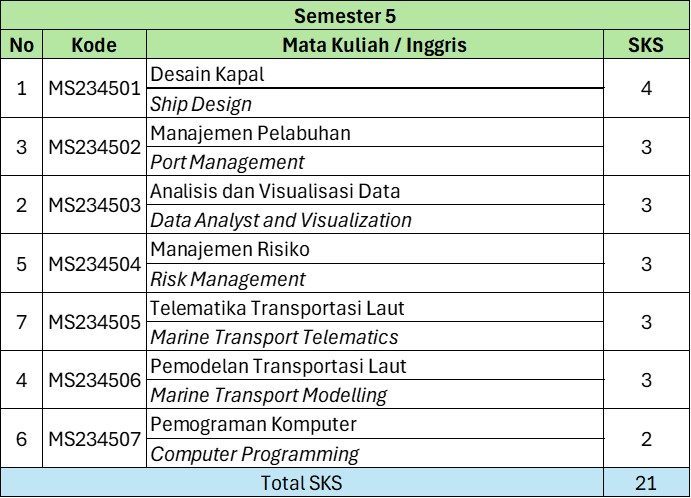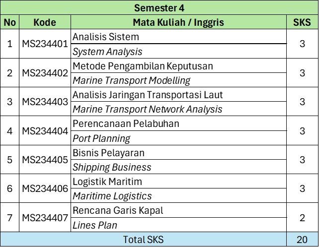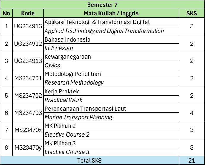 Pada tahap persiapan, mahasiswa dibekali mata kuliah dasar umum, mata kuliah basic science, mata kuliah dasar perkapalan dan dasar ilmu ekonomi. Sementara pada tahap sarjana, mahasiswa dibekali pengetahuan dasar teknik transportasi laut dan mata kuliah khusus serta keahlian yang menjadi ciri pokok bidang transportasi laut.