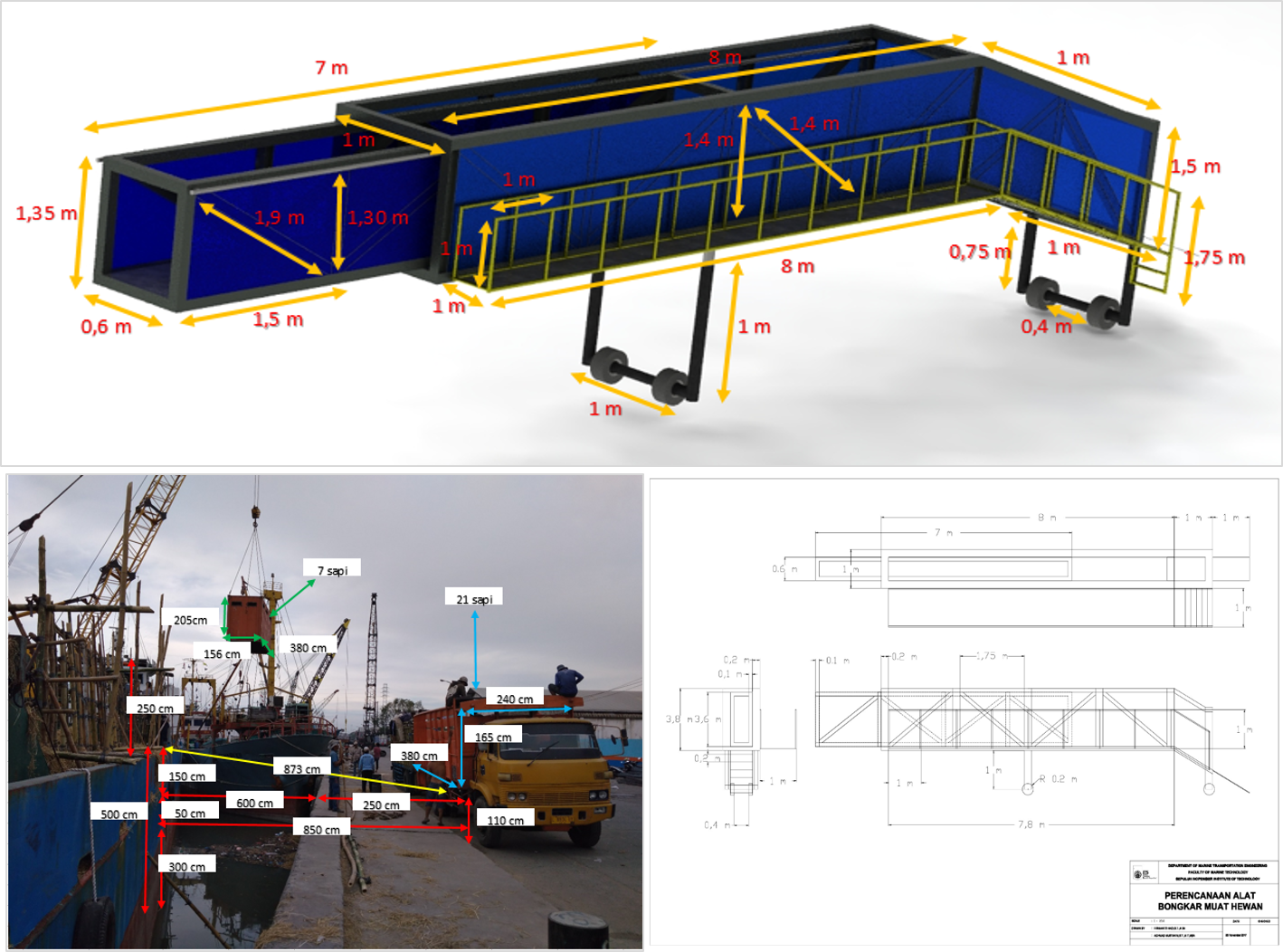 Inovasi desain alat bongkar muat yang ditawarkan adalah 2 (dua) yaitu bongkar muat dengan desain garbarata dan bongkar muat dengan kontainer. Dalam perancangan alat bongkar muat garbarata menerapkan konsep tangga hidrolik semi-horizontal yang menghubungkan kapal dan truk secara langsung. Inovasi desain peralatan bongkar muat ternak ini merupakan perpaduan antara desain dan jembatan pemadam kebakaran yang dilengkapi dengan peralatan angkat besi. Dalam 10 tahun perencanaan garbarata, membutuhkan total biaya Rp 505.247.583,00. Sedangkan manfaatnya didapat dalam perencanaan 10 tahun sebesar Rp 2.203.413.541,00. Nilai BCR (Benefit Cost Ratio) senilai 4,3 yang berarti alat tersebut layak diterapkan. Sedangkan pada perancangan alat bongkar muat dengan kontainer, pada 10 tahun perencanaan membutuhkan total biaya Rp 369.848.760,00. Manfaat yang dihasilkan dalam 10 tahun perencanaan adalah Rp 2.203.413.541,00, sehingga nilai BCR yang dihasilkan adalah 5,9 yang berarti alat tersebut layak diterapkan. Desain alat bongkar muat ini akan membuat bongkar muat lebih cepat. Waktu bongkar muat diperkirakan sampai 1 jam lebih cepat dari cara yang ada. Hal ini juga dapat meminimalkan risiko seperti cedera dan juga penurunan berat badan badan peternakan secara signifikan.