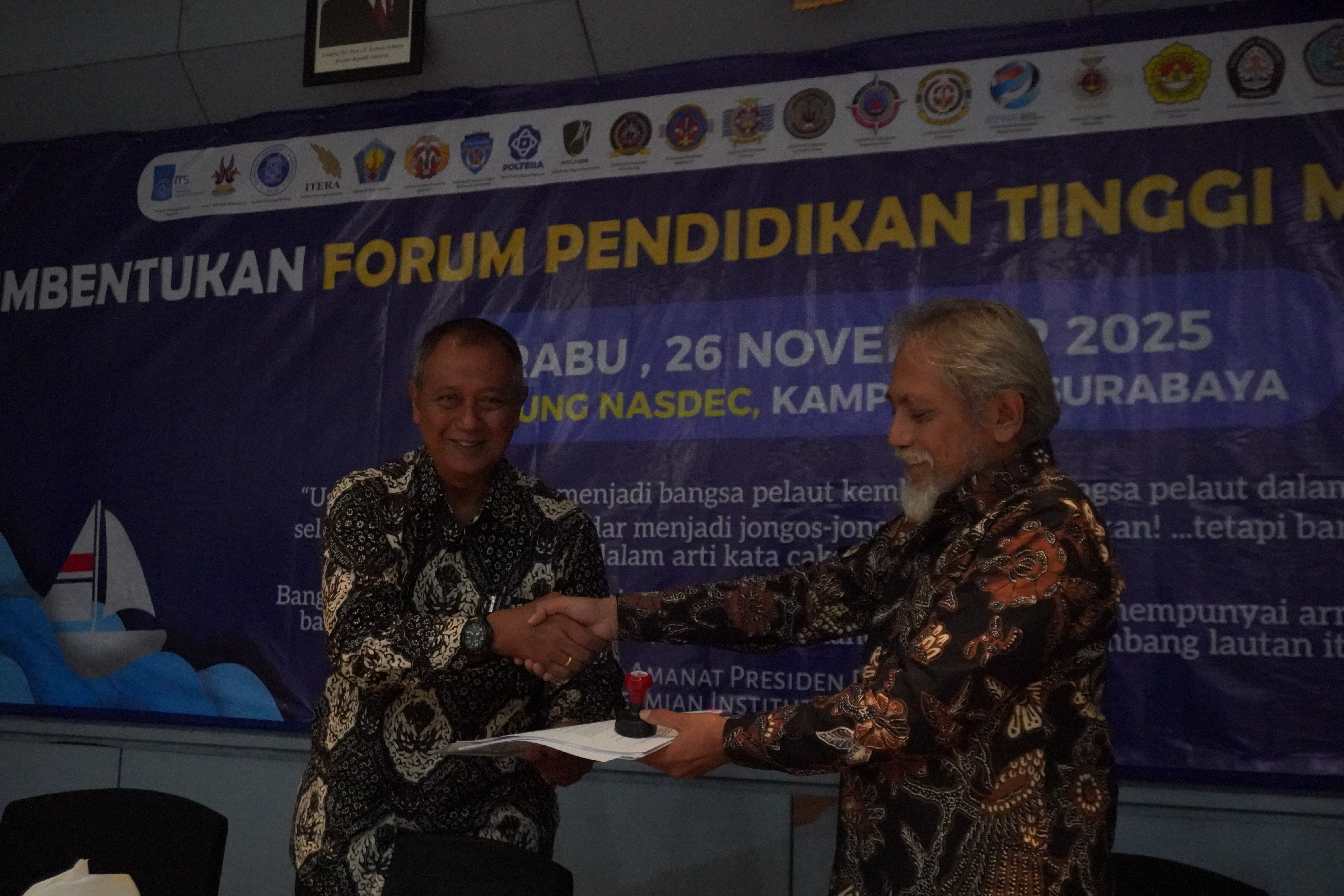 Following the committee meeting, the agenda proceeded to the signing of the official report and the inauguration of the prospective general chair as well as the DIKTIMARIN Forum itself. Based on the deliberations, Prof. Ir. Eko Budi Djatmiko, M.Sc., Ph.D., from the Department of Ocean Engineering at ITS, was appointed as the first General Chair of the DIKTIMARIN Forum. This appointment marks the beginning of collaborative efforts in maritime higher education in Indonesia through research, curriculum harmonization, and the development of globally competitive maritime human resources.