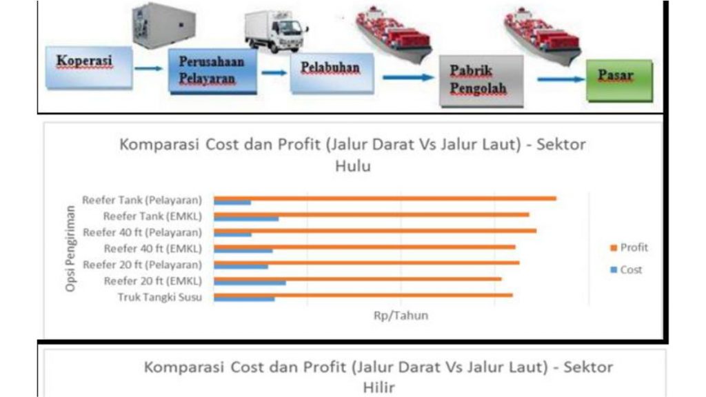 Distribution development is important in supporting the development of food security, especially distribution in areas that have the need for a particular food. Seeing the maritime potential of Indonesia, the distribution of food can be developed by using sea transportation. One type of food that many people need to consume is milk. In addition, for being healthy, milk also has many derivative products such as cheese and yogurt that also have important nutritional content. Supply Chain Management through the sea lane is conducted in two sectors, namely the upstream sector (Inbound) from milk storage to processing plants, and downstream (Outbound) from processing plants to markets. Delivery options are carried out using three conveyance means, i.e. reefer container, reefer tank container for upstream sector, with delivery options through forwardings and shipping lines, and downstream sector only using 20 ft containers with the same shipping options. By using the sea lane, the cooperative has a greater advantage, namely by using the option of 40 ft container, with the services of shipping line. While the processing factory is more profitable by using the services of shipping line for specific route of Surabaya to Denpasar.