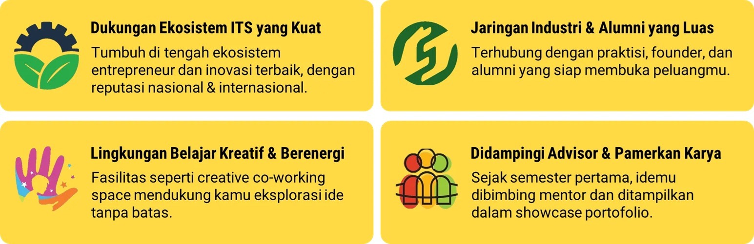 Di Prodi Sarjana Inovasi Digital, kamu nggak cuma belajar di kelas. Setiap langkahnya dirancang untuk membentukmu jadi inovator masa depan lewat cara belajar yang berbeda, pengalaman nyata, dan dukungan ekosistem terbaik. Inilah empat hal yang bikin kami istimewa: