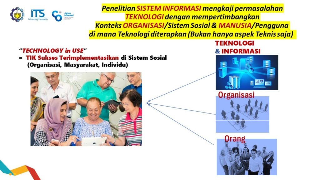 Penelitian SISTEM INFORMASI mengkaji permasalahan TEKNOLOGI dengan mempertimbangkan Konteks ORGANISASI/Sistem Sosial & MANUSIA/Pengguna di mana Teknologi diterapkan (Bukan hanya aspek Teknis saja)
