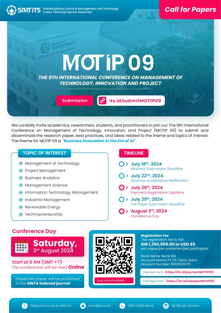We cordially invite academics, researchers, students, and practitioners to join our The9th International Conference on Management of Technology, Innovation, and Project (MOTIP 09) to submit and disseminate the research paper, best practices, and ideas related to the theme and topics of interest. The theme for, MOTIP 09 is “Business Innovation in the Era of AI”