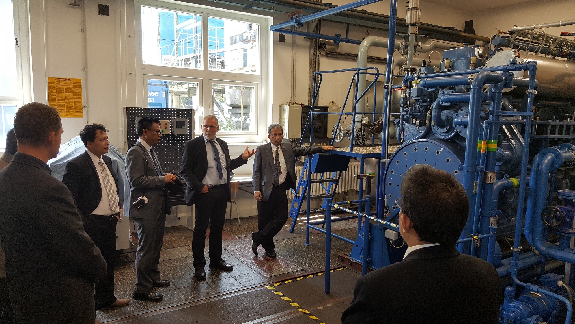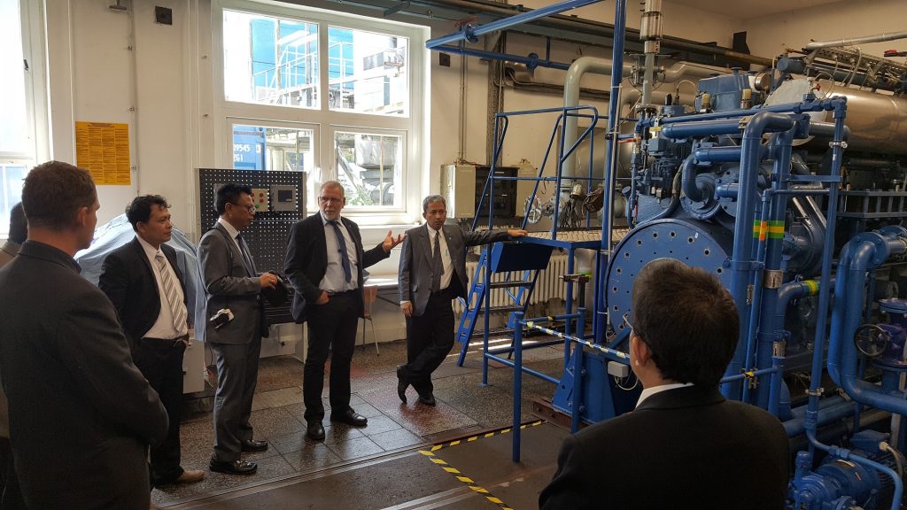 Prof. Karsten Wehner menjelaskan fasilitas laboratorium mesin kapal ke Rektor dan Delegasi ITS
