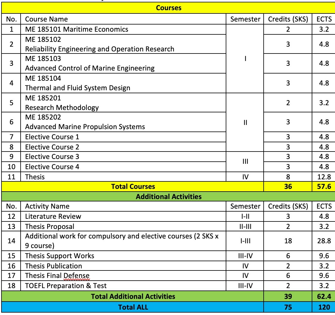 Program magister S2 di Departemen Teknik Sistem Perkapalan dengan masa studi 4 (empat) semester, pendidikan ditekankan pada upaya peningkatan nalar, pemahaman filosofis perancangan, manajemen perawatan kapal. Beberapa mata kuliah seperti Sistem Permesinan Lanjut; Sistem Listrik dan Otomatisasi Lanjut; Sistem Perpipaan Lanjut dan sebagainya. Termasuk didalamnya ada matakuliah pilihan yang dapat diambil mahasiswa.
