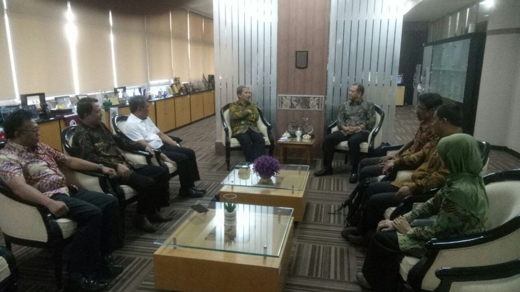 Rektor ITS (menghadap kamera kiri) menyambut Asesor BAN PT (menghadap kamera kanan dan kanannya)