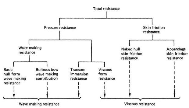 In the case of a vessel which is undergoing steady motion at slow speeds, that is where the ships weight balances the displacement upthrust without the significant contribution of hydrodynamics lift forces, the component of calm water resistance can be broken down into the contribution shown in below figure. In addition to these components there is of course the air resistance and added resistance due to tough weather.