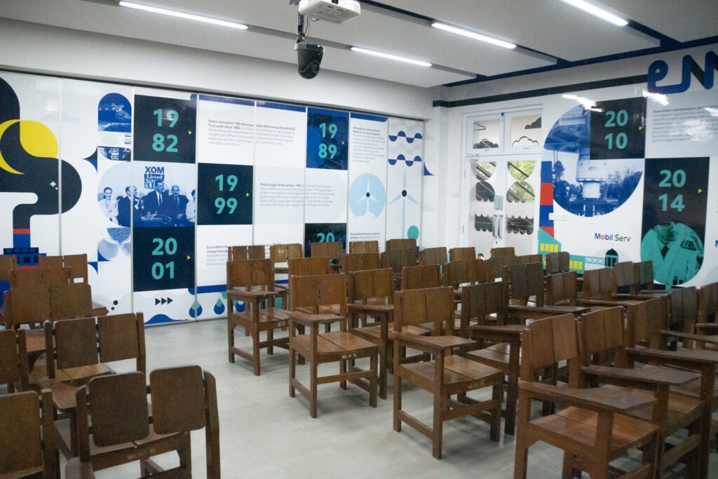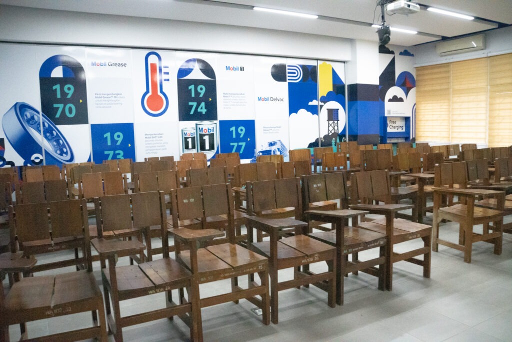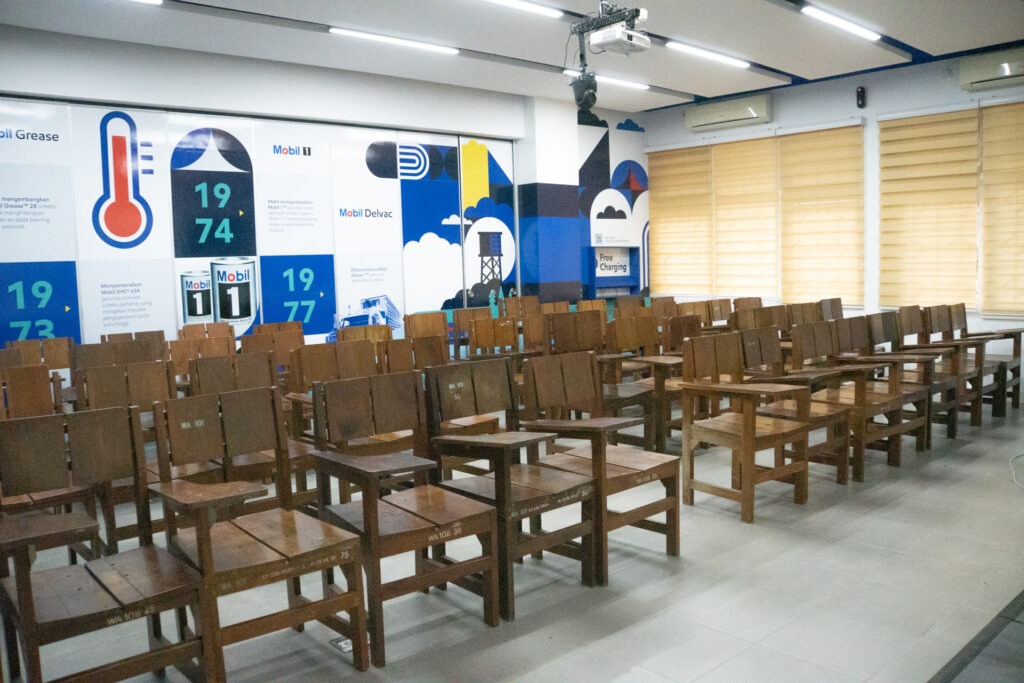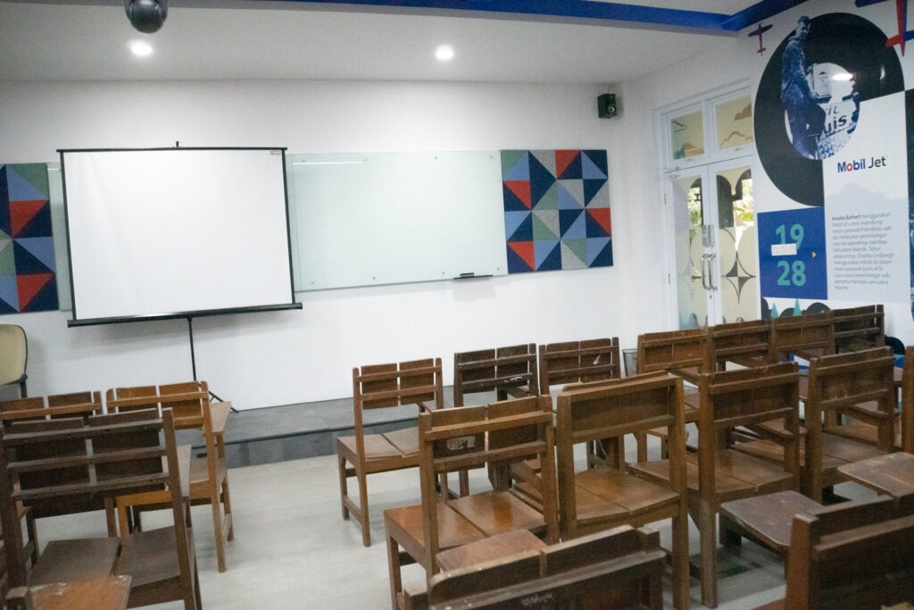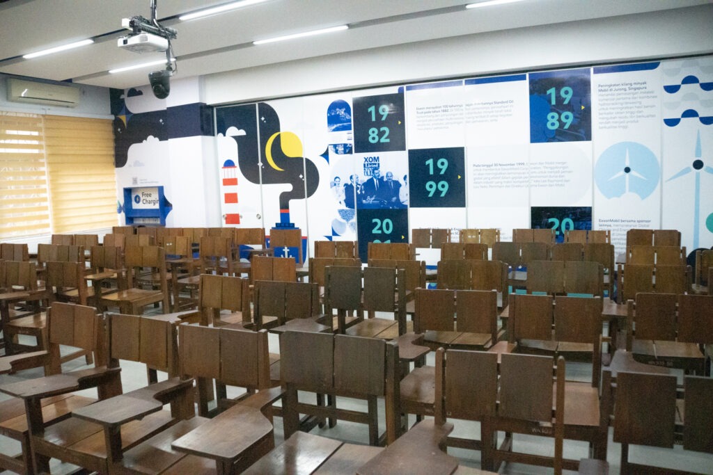 This classroom has received a grant from PT. EXXON MOBILE 1, providing funding for several key facilities and support systems. In the case of WA 102-103, primary facilities encompass wooden chairs and desks, a whiteboard, and a partition door between classrooms 102 and 103, which can be opened or closed based on the specific requirements of the class. Additionally, supporting amenities such as air conditioning and a large projector screen enable its utilization as a comprehensive educational platform for lectures involving a substantial number of students, exceeding 50 individuals.