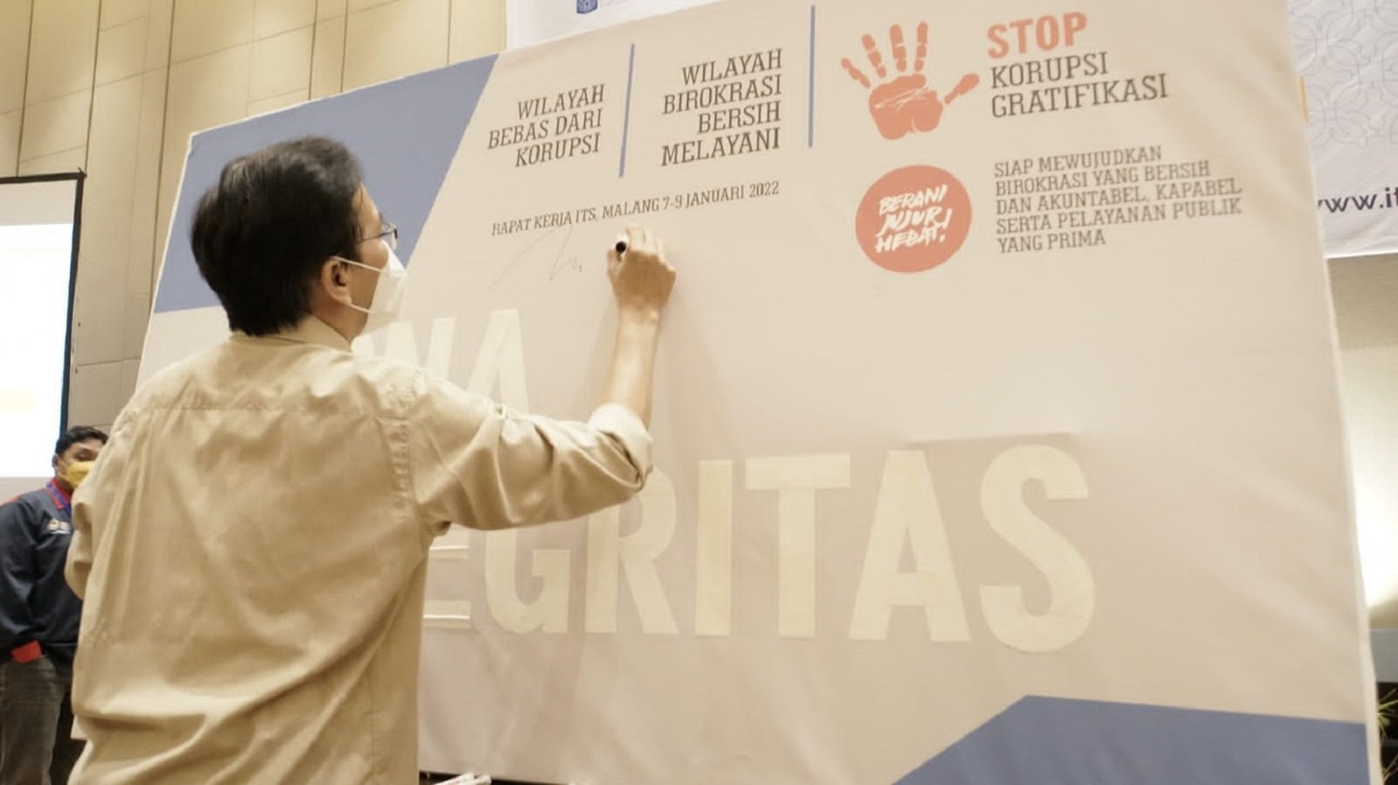 Rektor ITS Prof Dr Ir Mochamad Ashari MEng menandatangani lembar komitmen bersama Pembangunan Zona Integritas (ZI) dan internalisasi Whistleblowing