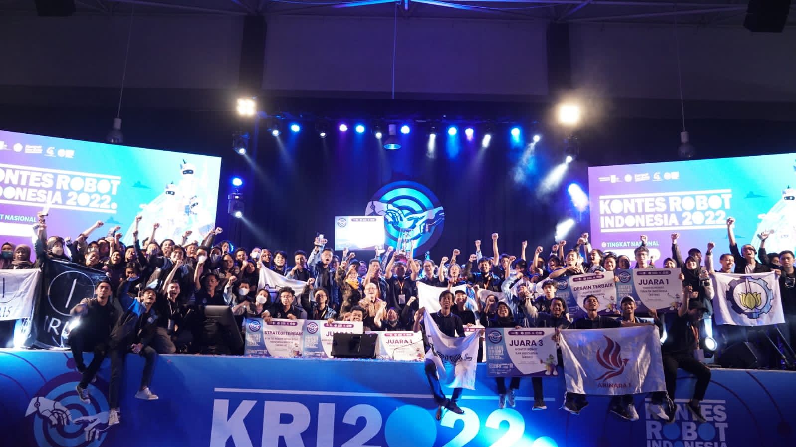 Rektor ITS Prof Dr Ir Mochamad Ashari MEng mengangkat piala Sambhawana Pratimacala yang merupakan piala bergilir KRI untuk Divisi KRAI didampingi oleh Plt. Kepala Pusprenas Asep Sukmayadi SIP Msi