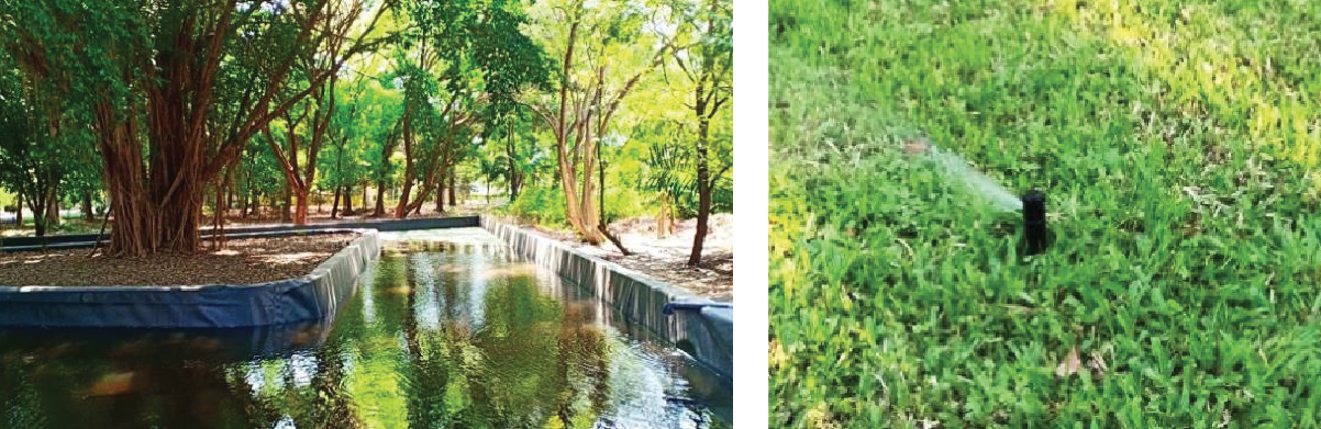 Pengolahan air bekas wudhu digunakan sebagai air baku kolam (ikan) di kawasan Masjid Manarul Ilmi ITS dan sebagai sumber air penyiraman tanaman di sekitar masjid. Selain itu juga terdapat penggunaan air dari kamar mandi atau grey water untuk menyiram tanaman, hasil pengolahan ditampung di dalam constructed wetland.
