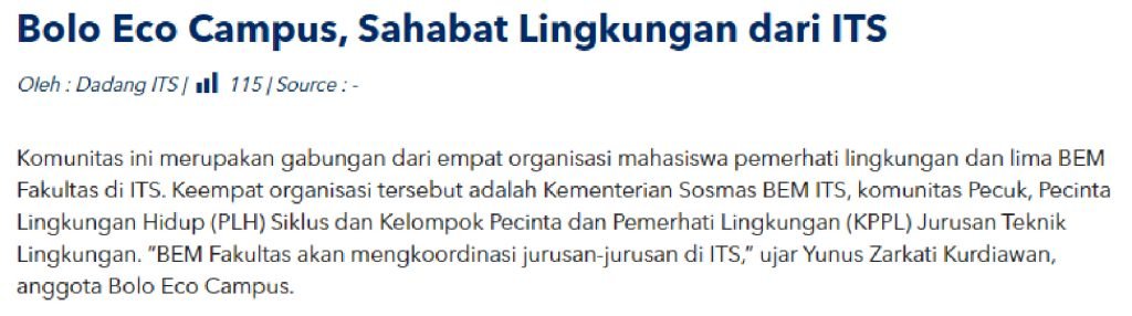 Komunitas ini merupakan gabungan dari empat organisasi mahasiswa pemerhati lingkungan dan lima BEM Fakultas di ITS. Keempat organisasi tersebut adalah Kementerian Sosmas BEM ITS, komunitas Pecuk, Pecinta Lingkungan Hidup (PLH) Siklus dan Kelompok Pecinta dan Pemerhati Lingkungan (KPPL) Departemen Teknik Lingkungan.