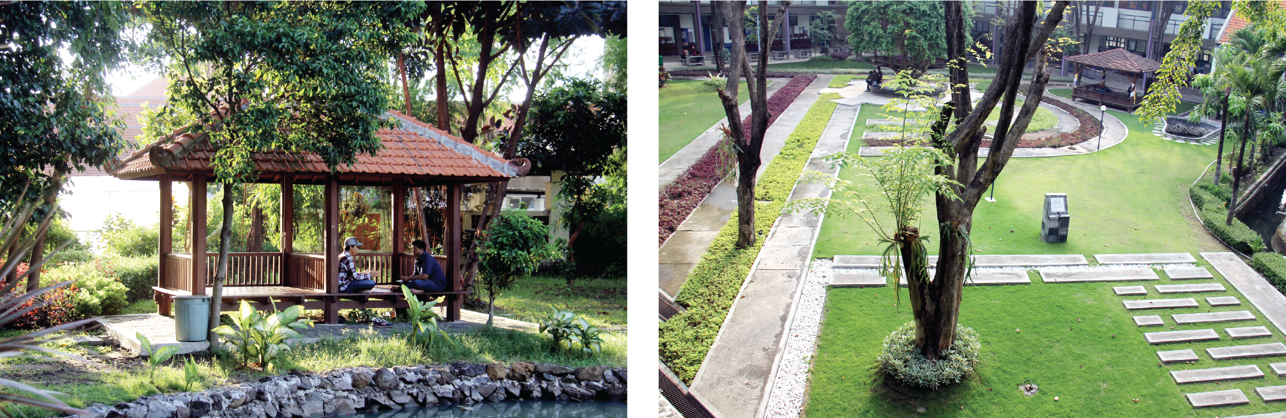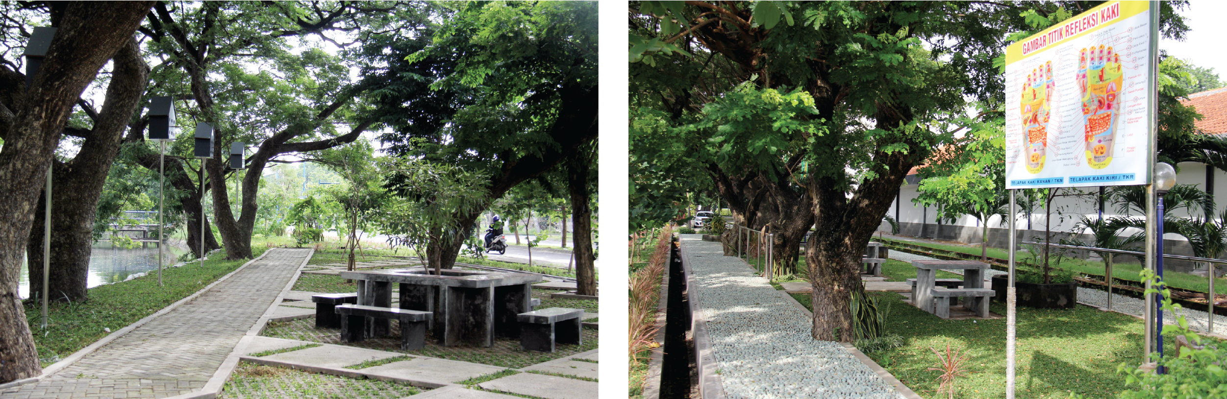 Taman sebagai ruang terbuka hijau dan tempat duduk yang dapat digunakanuntuk istirahat.