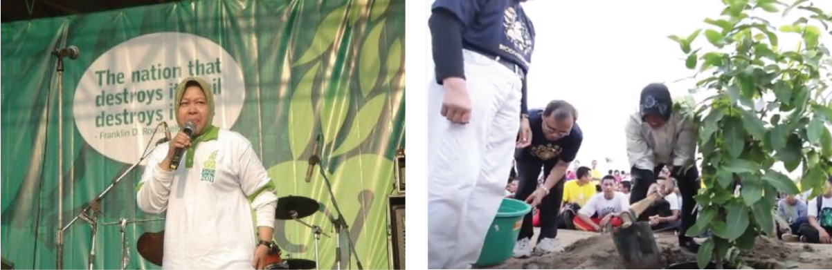 Wali Kota Surabaya, Ir Tri Rismaharini MT yang menyempatkan hadir dalam kegiatan ini, dengan menanam pohon pertama dalam kegiatan acara dan secara simbolis memasang pin kepada mahasiswa bersama Rektor ITS.