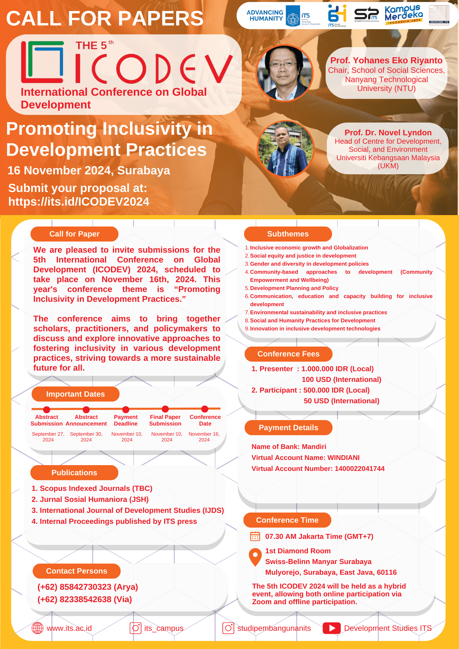 We are pleased to invite papers for the International Conference on Global Development (ICODEV) 2024 to be held in November 16th, 2024. The theme of the conference is “Promoting Inclusivity in Development Practices”. This conference aims to unite to discuss and explore innovative approaches for fostering inclusivity in various development practices, and to have a better and sustainable for all. The paper must be written in English with an abstract of at least 250 words with the following scopes. Subthemes: