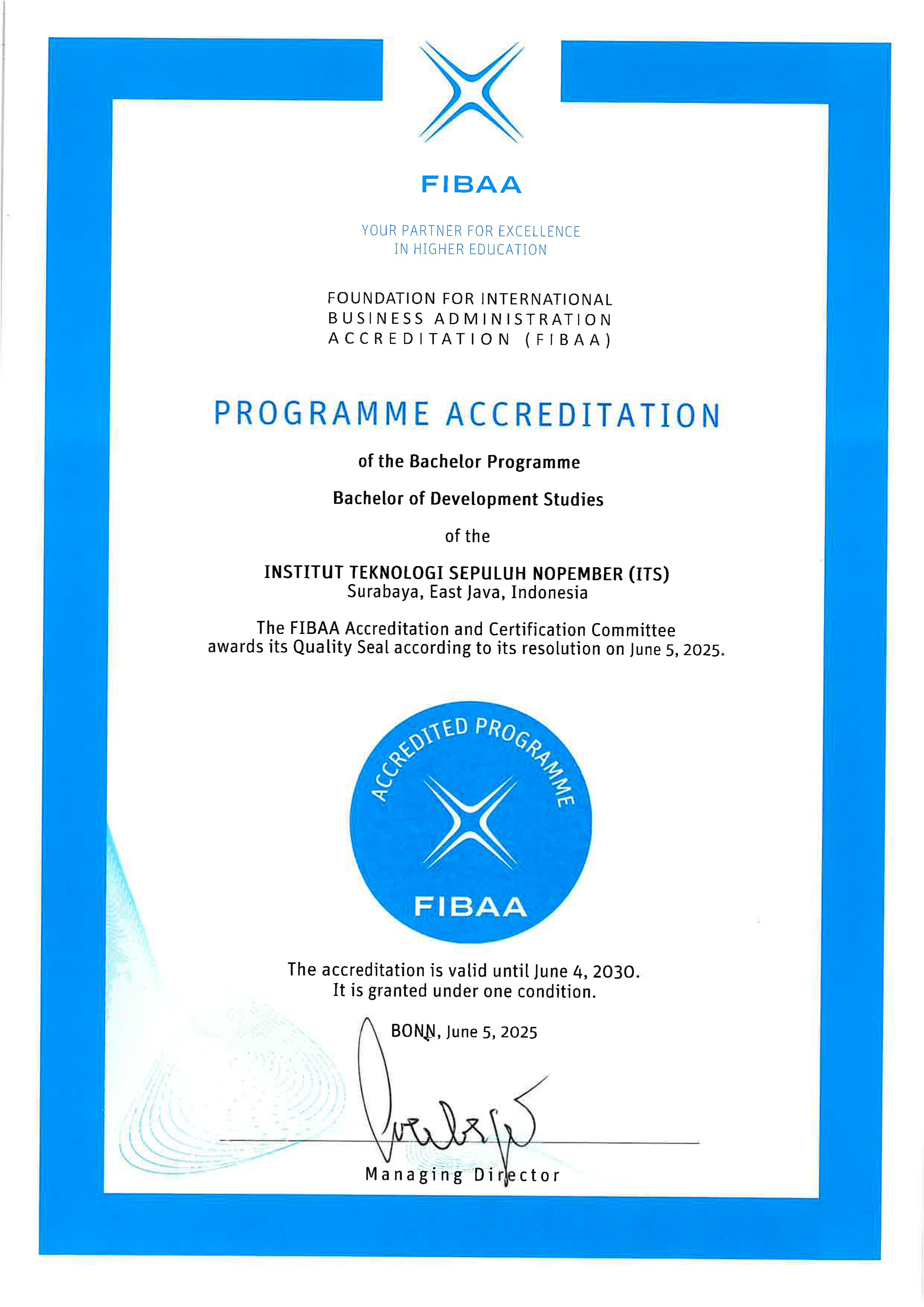 Departemen Studi Pembangunan telah dinyatakan Terakreditasi Internasional FIBAA berdasarkan SK Nomor : D8552_IT2.V_B_TU.00.09_VI_2025 dan berlaku mulai 5 Juni 2025 sampai dengan 4 Juni 2030.