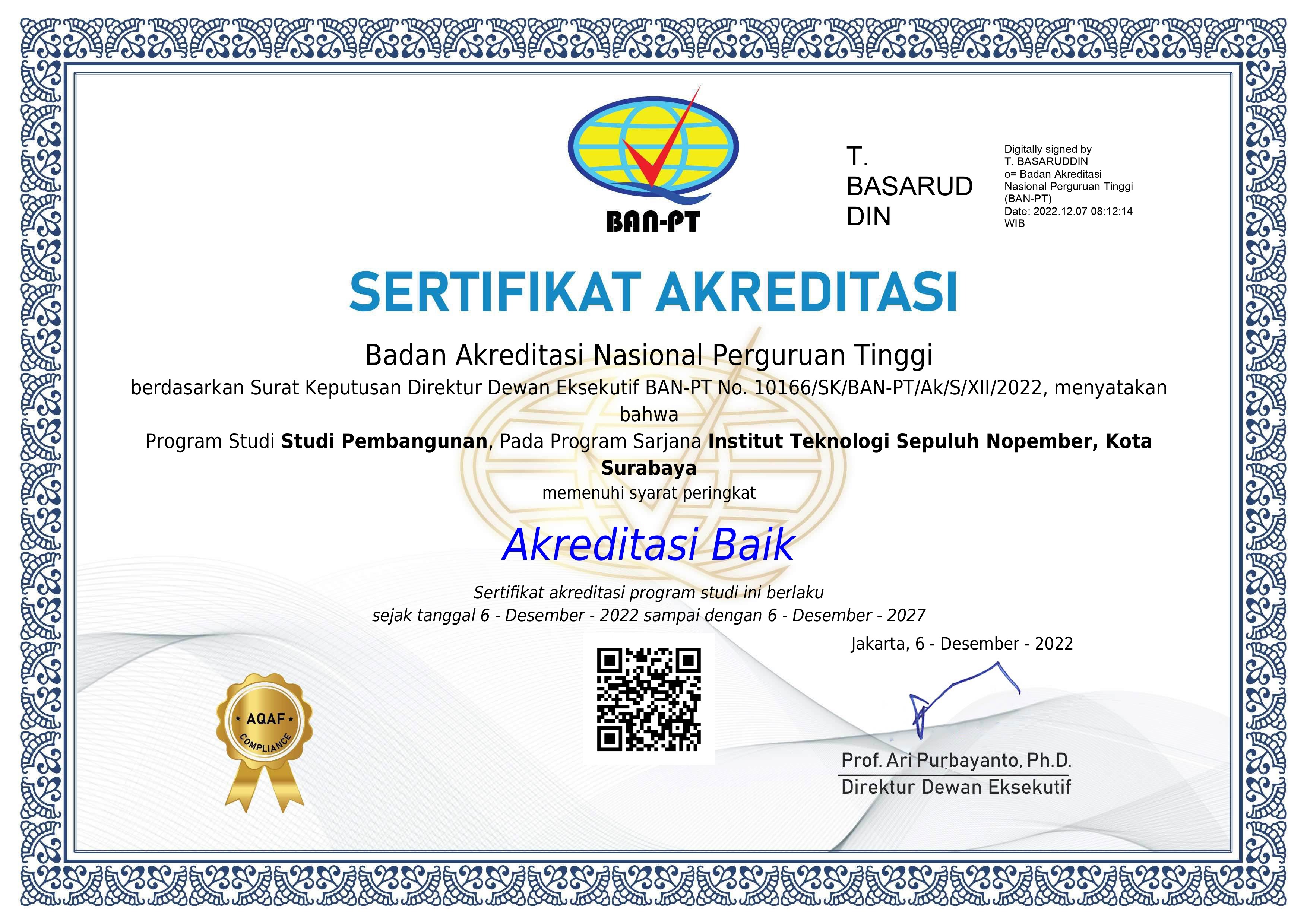 Departemen Studi Pembangunan telah dinyatakan sebagai departemen dengan Peringkat Akreditasi Baik berdasarkan SK BAN-PT Nomor: 10166/SK/BAN-PT/Ak/S/XII/2022 dan berlaku mulai tanggal 6 Desember 2022 sampai dengan 6 Desember 2027. Download sertifikat disini.