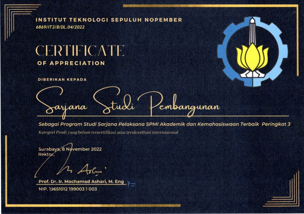 Departemen Studi Pembangunan ITS memiliki reputasi di tingkat nasional. Hal ini dibuktikan dengan akreditasi dan sertifikat yang menjamin kualitas pendidikan dan penelitian di Departemen Studi Pembangunan. Akreditasi Departemen Studi Pembangunan berdasarkan SK BANPT Nomor: 1659/SK/BAN-PT/Ak-PKP/S/III/2022 adalah Peringkat Akreditasi Baik, yang berlaku mulai tanggal 15 Maret 2022.
